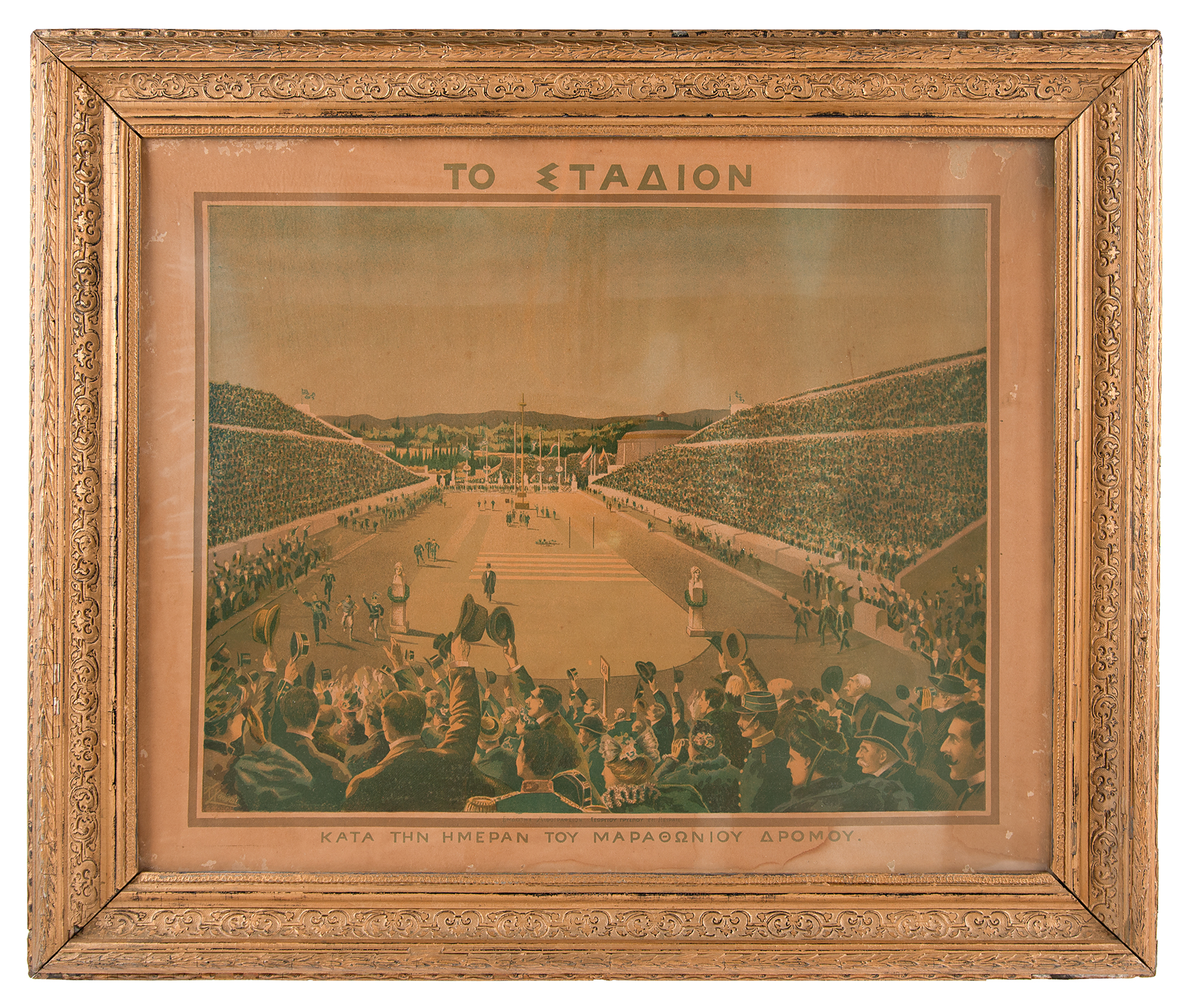 Original circa 1896 color 23 x 18.5 chromolithographic print entitled "The Stadium on the Day of the Marathon" by K. Haoupi, portraying a view of the Olympic stadium filled with spectators to witness the end of the historic first Olympic marathon. The artist portrays himself in a top hat in the lower right of the image. Displayed in a period frame to an overall size of 28 x 24. In very good to fine condition, with scuffing and dampstaining to the margins.