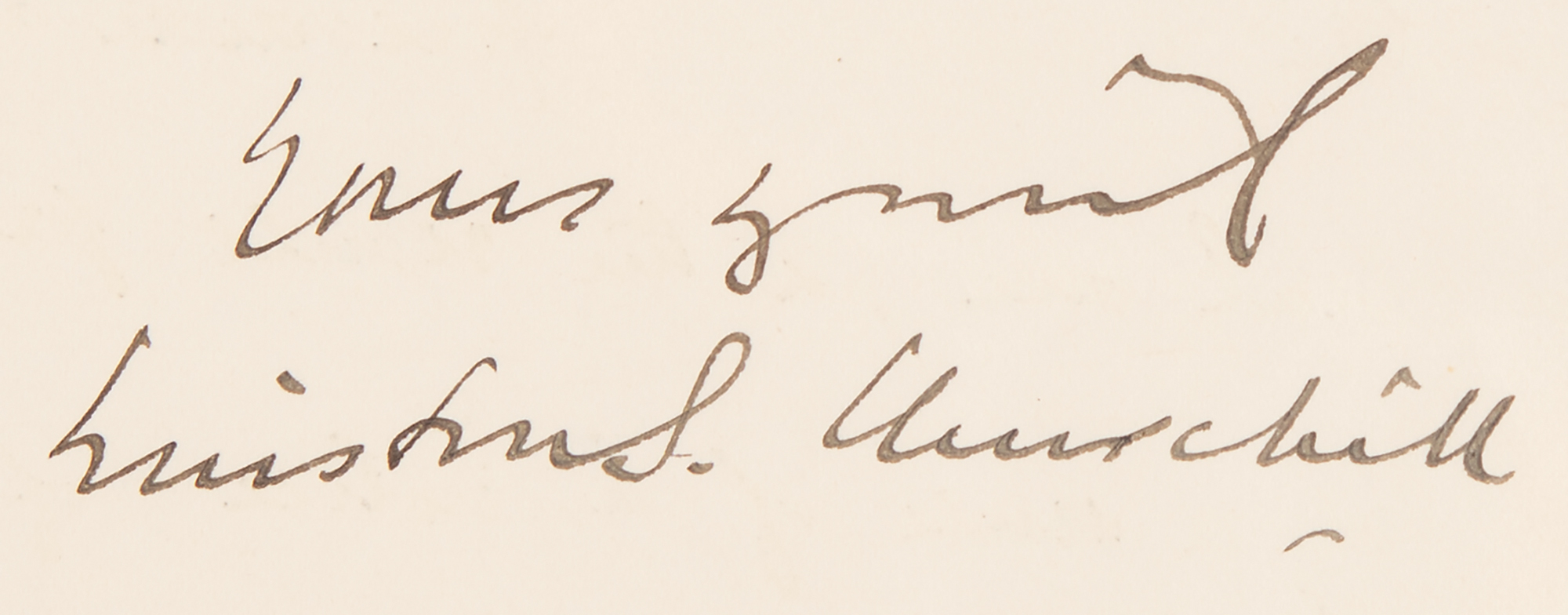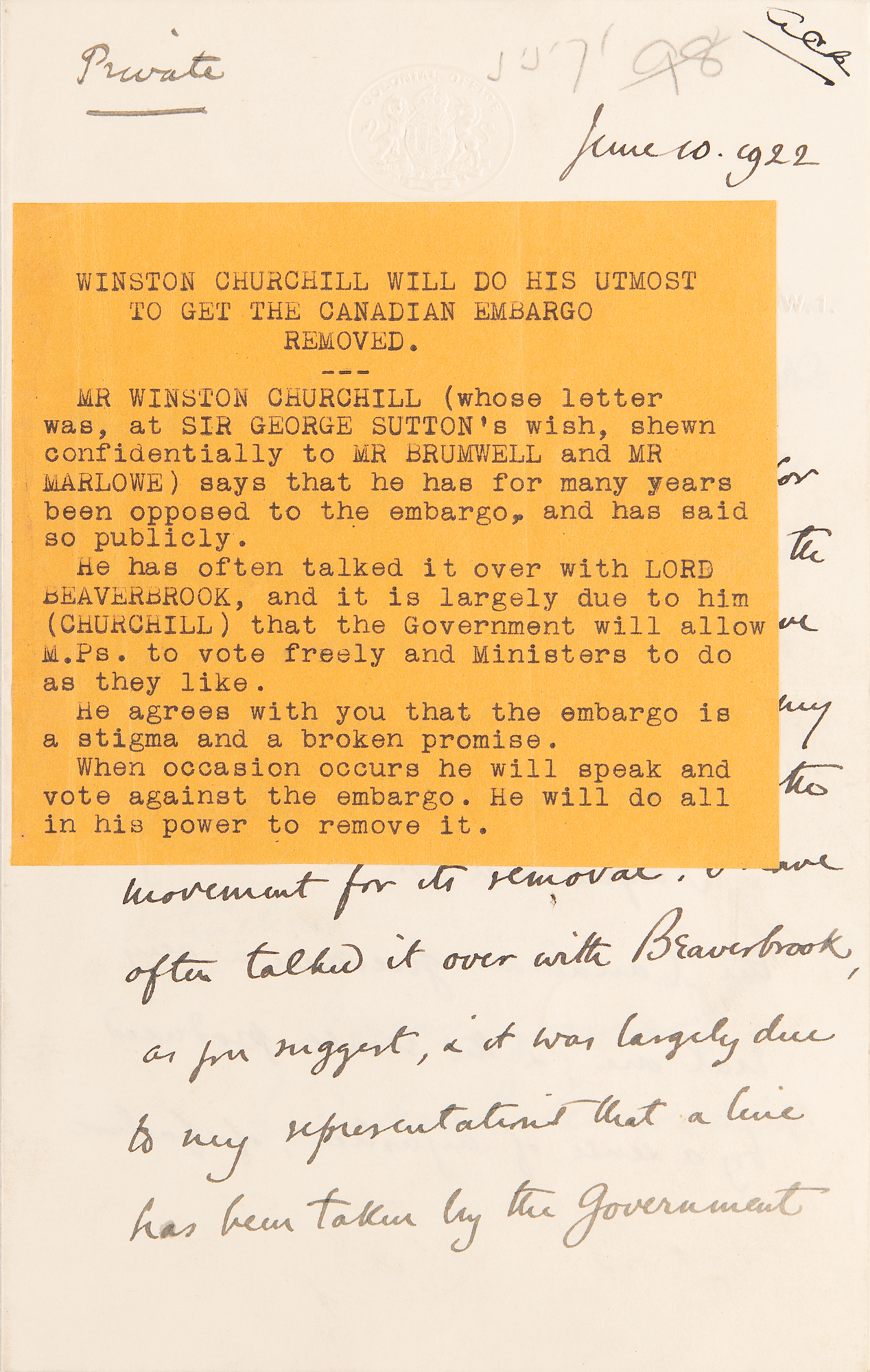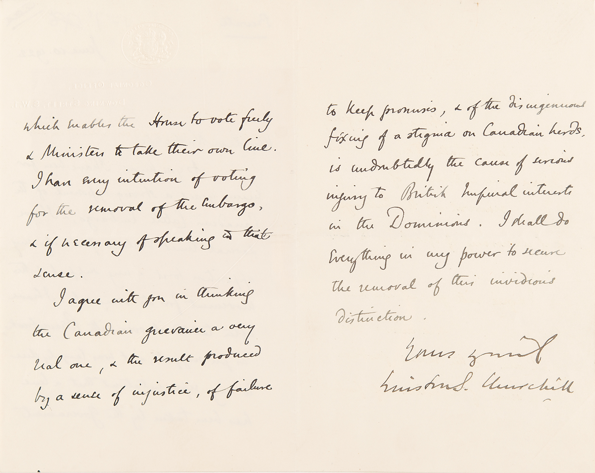 ALS as the Secretary of State for the Colonies, signed “Winston S. Churchill,” three pages on two adjoining sheets, 5 x 8, embossed Colonial Office letterhead, June 10, 1922. Marked “Private,” a handwritten letter to Alfred Harmsworth, 1st Viscount Northcliffe, in full: “As you know, I have been for many years a strong opponent of the Canadian Cattle Embargo, & I have several times declared publicly my opposition to it & my support of the movement for its removal. I have often talked it over with Beaverbrook, as you suggest, & it was largely due to my representations that a line has been taken by the Government which enables the House to vote freely & Ministers to take their own line. I have every intention of voting for the removal of the Embargo, & if necessary of speaking in that sense. I agree with you in thinking the Canadian grievance a very real one, & the result produced by a sense of injustice, of failure to keep promises, & of the disingenuous fixing of a stigma on Canadian herds, is undoubtedly the cause of serious injury to British Imperial interests in the Dominions. I shall do everything in my power to secure the removal of this invidious distinction." Affixed to the left edge is a typed secretarial summary of Churchill’s letter. In fine condition. Accompanied by a custom clamshell presentation case.