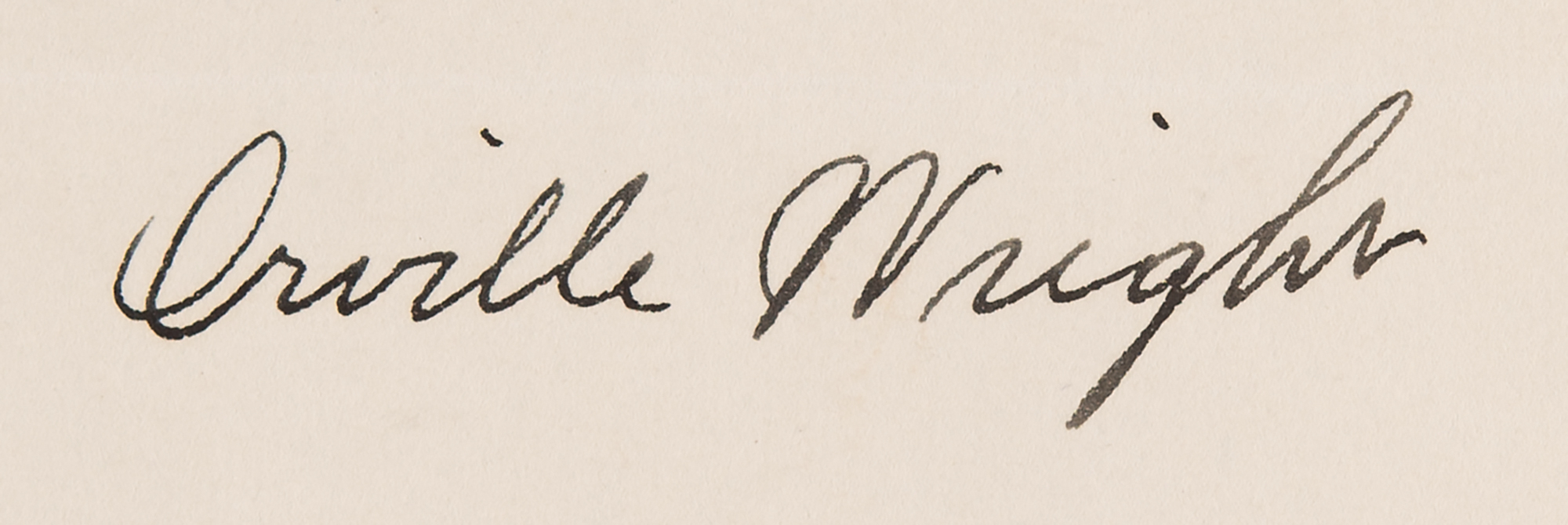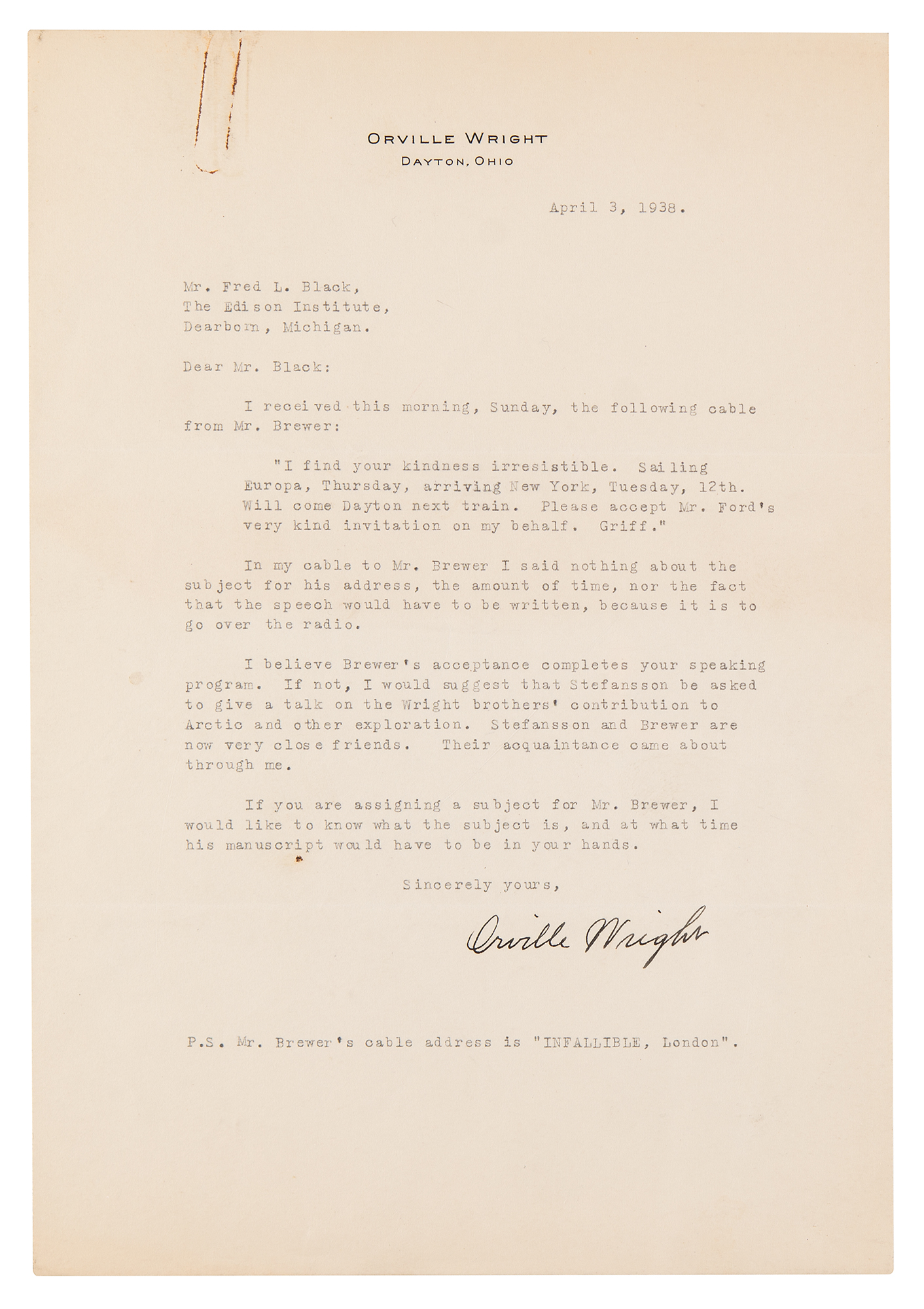TLS, one page, 7.25 x 10.5, personal letterhead, April 3, 1938. Letter to Fred L. Black of The Edison Institute in Dearborn, Michigan, in full: “I received this morning, Sunday, the following cable from Mr. Brewer: ‘I find your kindness irresistible. Sailing Europa, Thursday, arriving New York, Tuesday, 12th. Will come Dayton next train. Please accept Mr. Ford's very kind invitation on my behalf. Griff.’ In my cable to Mr. Brewer I said nothing about the subject for his address, the amount of time, nor the fact that the speech would have to be written, because it is to go over the radio. I believe Brewer's acceptance completes your speaking program. If not, I would suggest that Stefansson be asked to give a talk on the Wright brothers’ contribution to Arctic and other exploration. Stefansson and Brewer are now very close friends. Their acquaintance came about through me. If you are assigning a subject for Mr. Brewer, I would like to know what the subject is, and at what time his manuscript would have to be in your hands.” Wright adds a short postscript: “Mr. Brewer's cable address is ‘INFALLIBLE, London.’ In fine condition, with a rusty paperclip impression to the top edge. Accompanied by a custom clamshell presentation case.