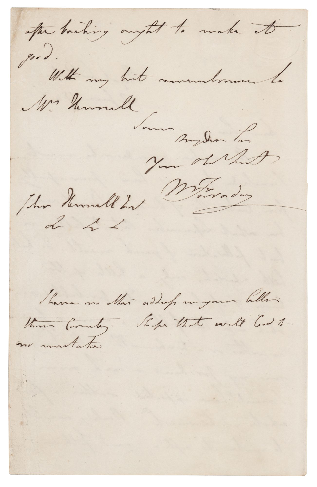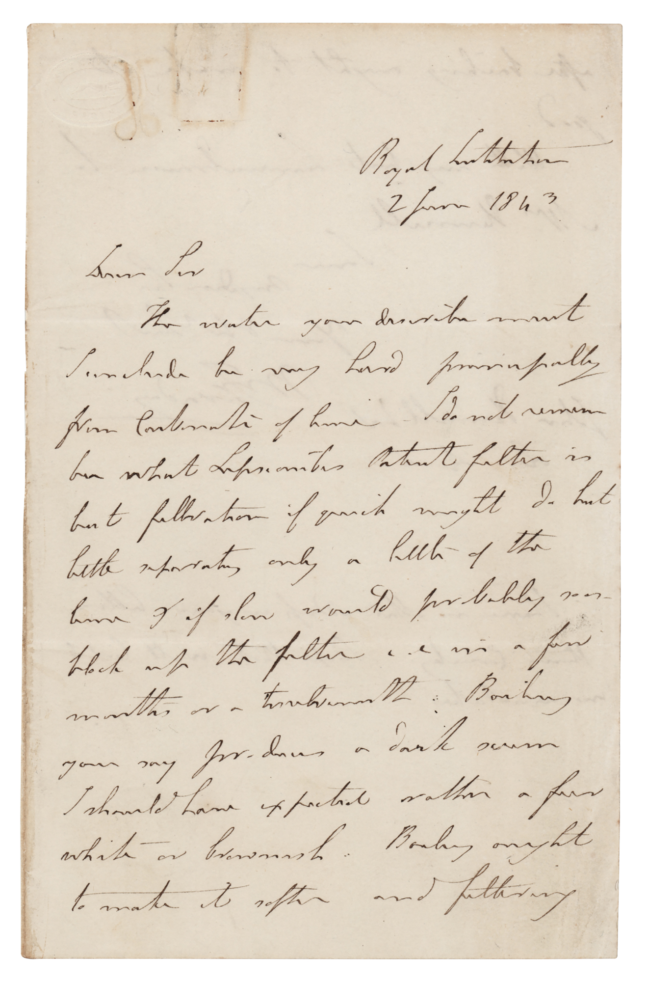 ALS signed “M. Faraday,” one page both sides, 4.5 x 7.25, June 2, 1843. Addressed from the “Royal Institution,” a handwritten letter to John Hennell, in full: “The water you describe must I conclude be very hard principally from Carbonate of lime. I do not remember what Lepuantes Patent filter is but filtration if quick might do but little separating only a little of the lime & if slow would probably not block up the filter in a few months or a twelvemonth. Boiling you say produces a dark scum. I should have expected rather a fine white or brownish. Boiling ought to make it softer and filtering after boiling ought to make it good. With my best remembrance to Mrs. Hennell.” Faraday adds a postscript: “I have no other address in your letter than County. I hope that will lead to our mistake.” In fine condition, with a few light paperclip impressions to the top edge.