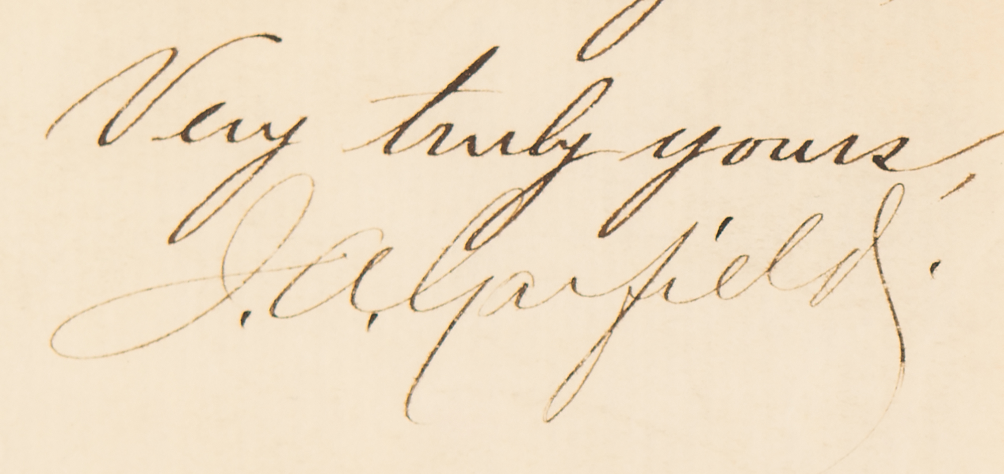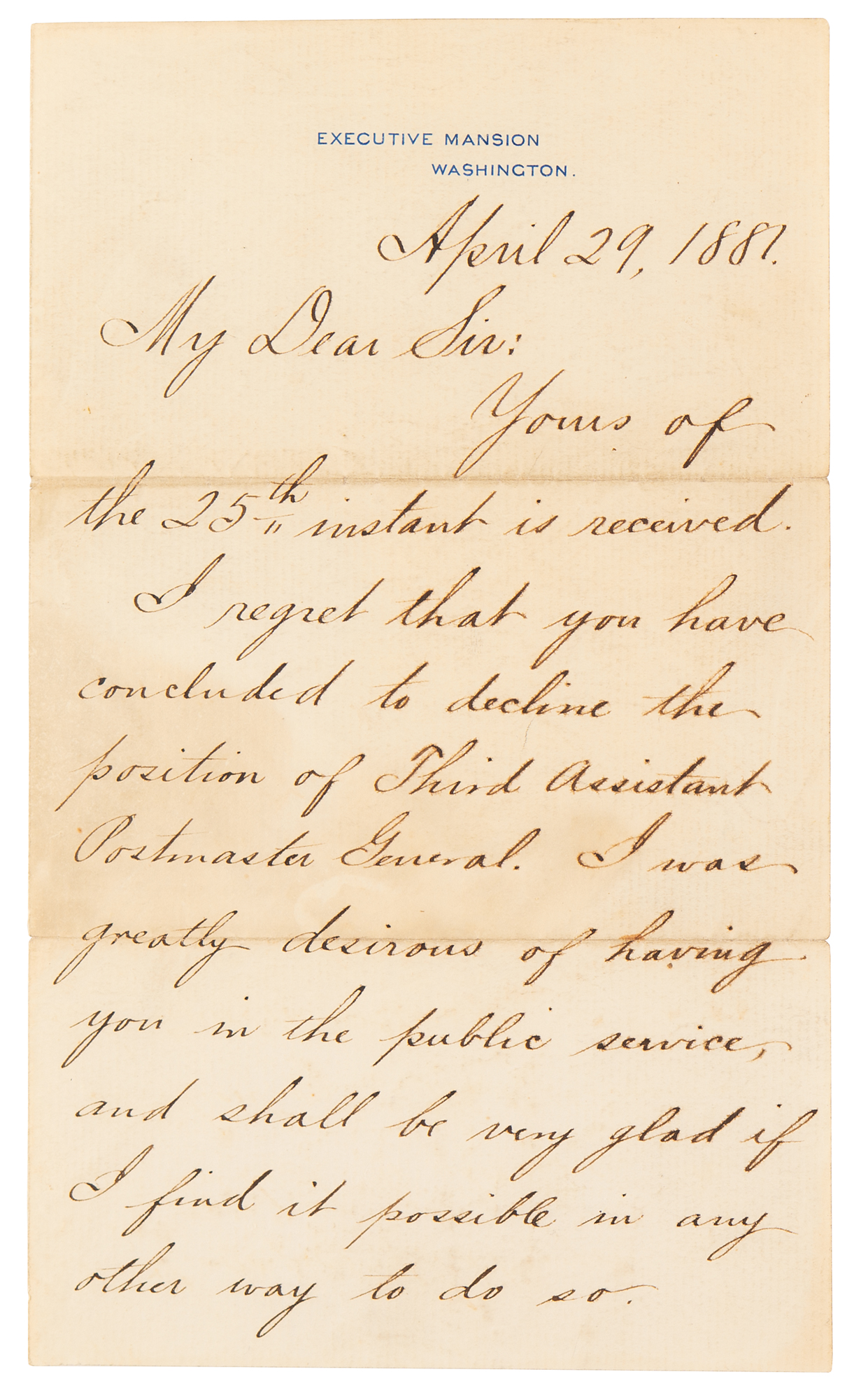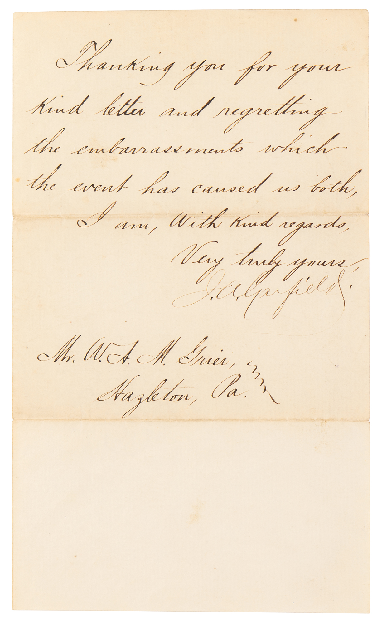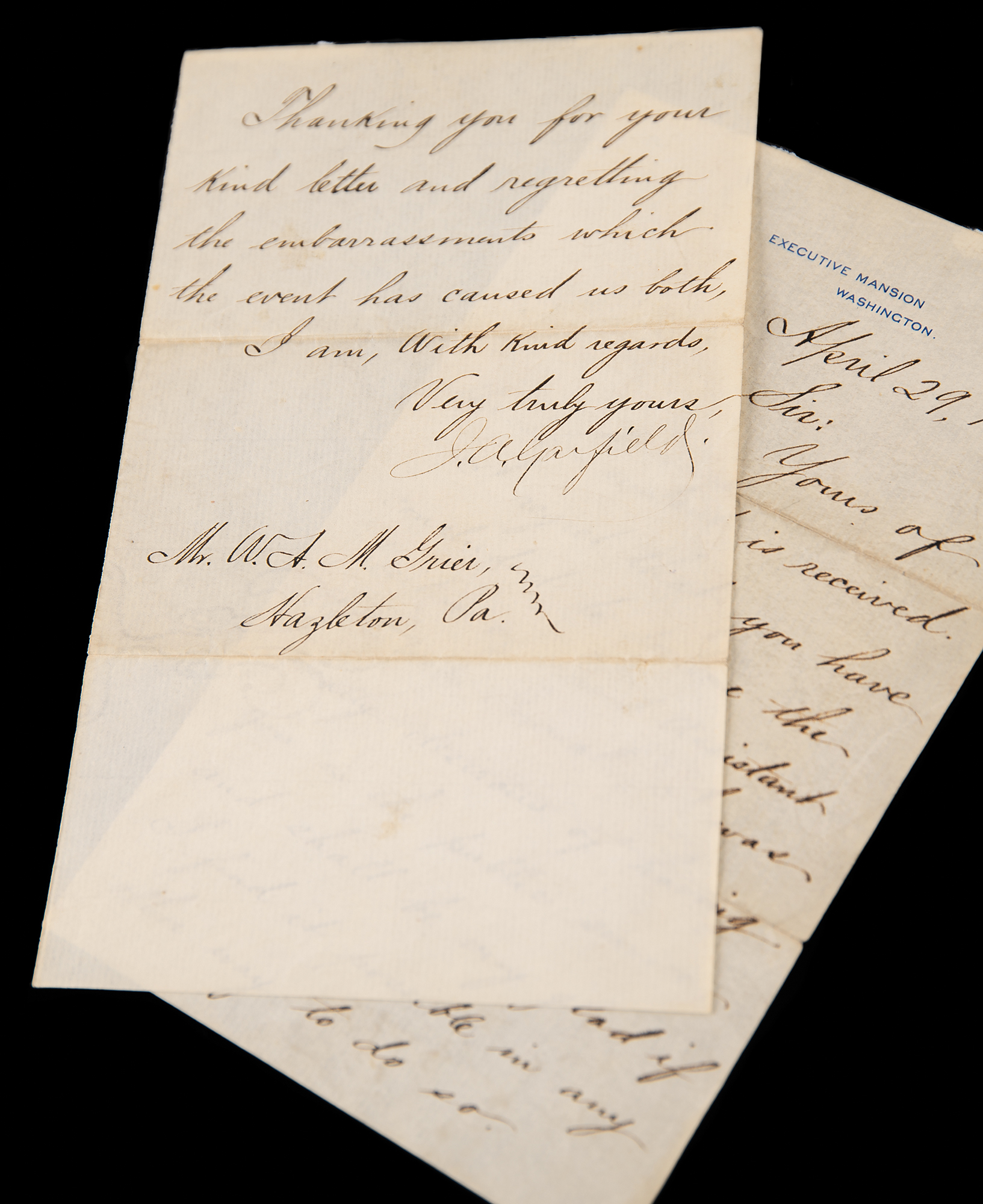 Rare LS as president, signed “J. A. Garfield,” two pages, 5.5 x 9, Executive Mansion letterhead, April 29, 1881. Letter to W. A. M. Grier in Hazleton, Pennsylvania, in part: "I regret that you have concluded to decline the position of Third Assistant Postmaster General. I was greatly desirous of having you in the public service, and shall be very glad if I find it possible in any other way to do so. Thanking you for your kind letter and regretting the embarrassments which the event has caused us both." In fine condition, with an area of light toning to the first page.