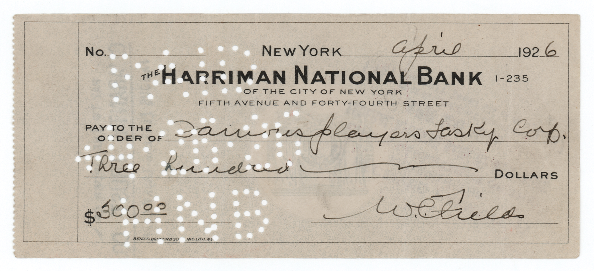 Harriman National Bank check, 6.25 x 2.75, filled out and signed by Fields, "W. C. Fields," payable to Famous Players Lasky Corp. for $300, April 1926. In fine condition, with several unobtrusive vertical folds.