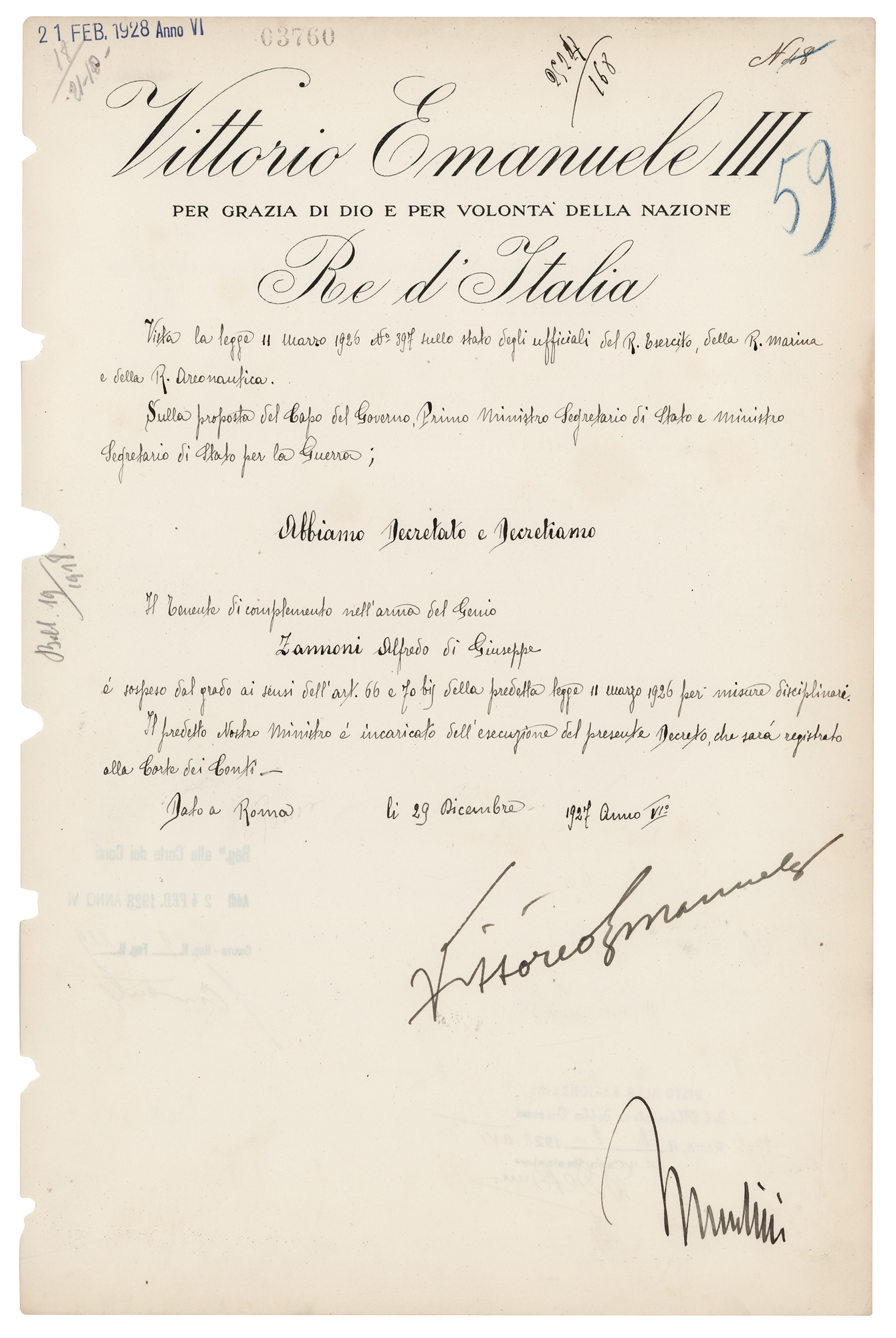 Manuscript DS in Italian, signed “Mussolini" and "Vittorio Emanuele,” one page, 9.5 x 14.5, December 29, 1927. Official military document, in part (translated): "Considering the law of March 11, 1926, No. 397, regarding the status of officers of the Royal Army, the Royal Navy, and the Royal Air Force; Upon the proposal of the Head of Government, Prime Minister, Secretary of State, and Minister Secretary of State for War; We have decreed and hereby decree: The reserve lieutenant in the engineering corps, Zannoni Alfredo di Giuseppe, is suspended from rank pursuant to Article 66e of the aforementioned law of March 11, 1926, as a disciplinary measure. Our aforementioned Minister is entrusted with the execution of this Decree, which will be registered with the Court of Accounts." Prominently signed at the conclusion in ink by Benito Mussolini and Vittorio Emanuele III. In fine condition, with small binding hole tears along the left edge.