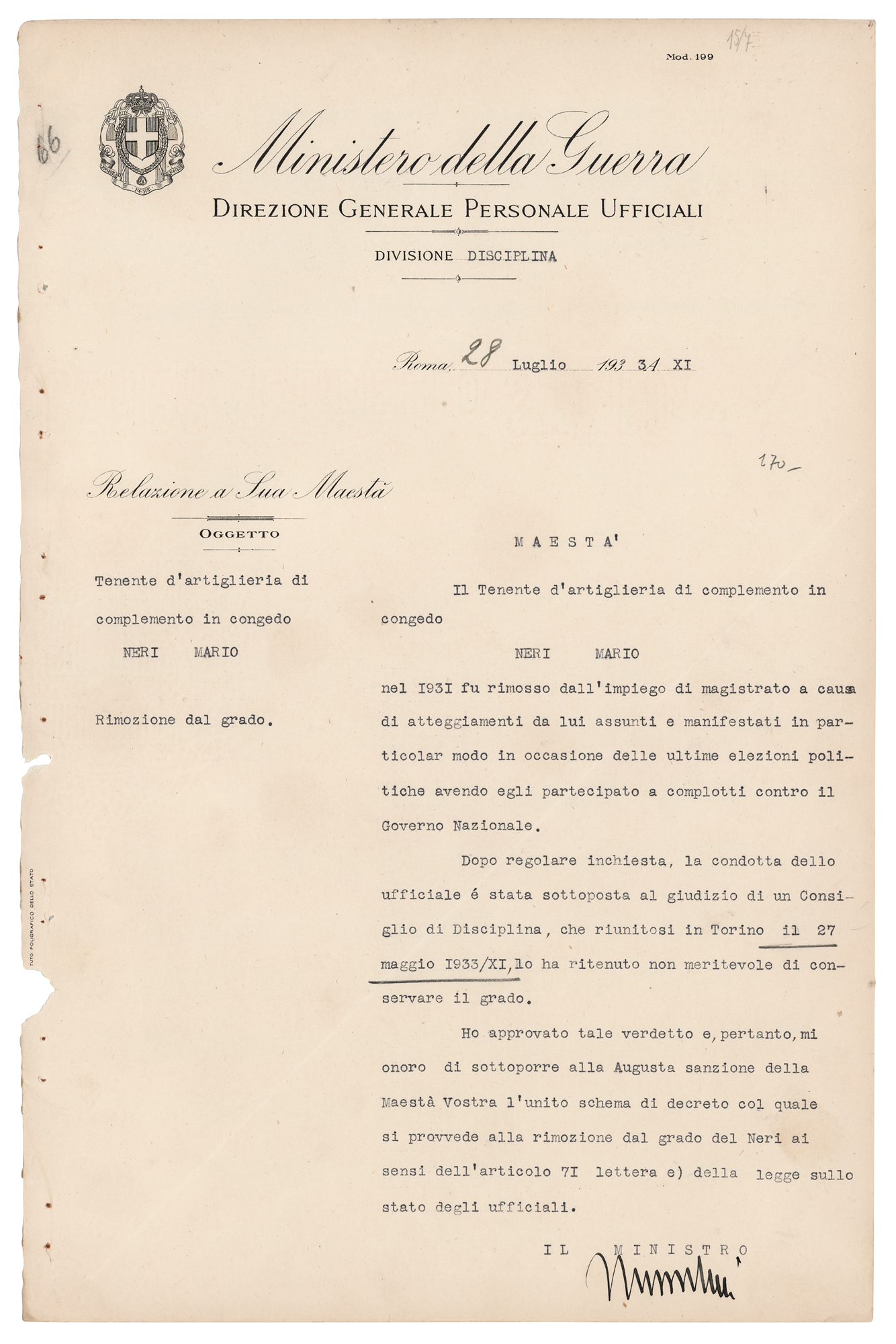 DS in Italian, signed “Mussolini,” one page, 9.5 x 14.5, July 28, 1933. Official military disciplinary document, in part (translated): "Your Majesty, the reserve artillery lieutenant, Neri Mario, was removed from his position as a magistrate in 1931 due to attitudes he adopted and demonstrated, especially during the last political elections, as he participated in plots against the National Government. Following a formal investigation, the conduct of the officer was reviewed by a Disciplinary Council, which met in Turin on May 27, 1933 (Year XI), and deemed him unworthy of retaining his rank. I have approved this verdict and, therefore, have the honor to submit to Your Majesty’s August sanction the attached draft decree providing for the removal of Neri's rank under Article 71, letter (e), of the law on the status of officers." Boldly signed at the conclusion in fountain pen by Benito Mussolini. In fine condition, with small binding holes along the left edge.