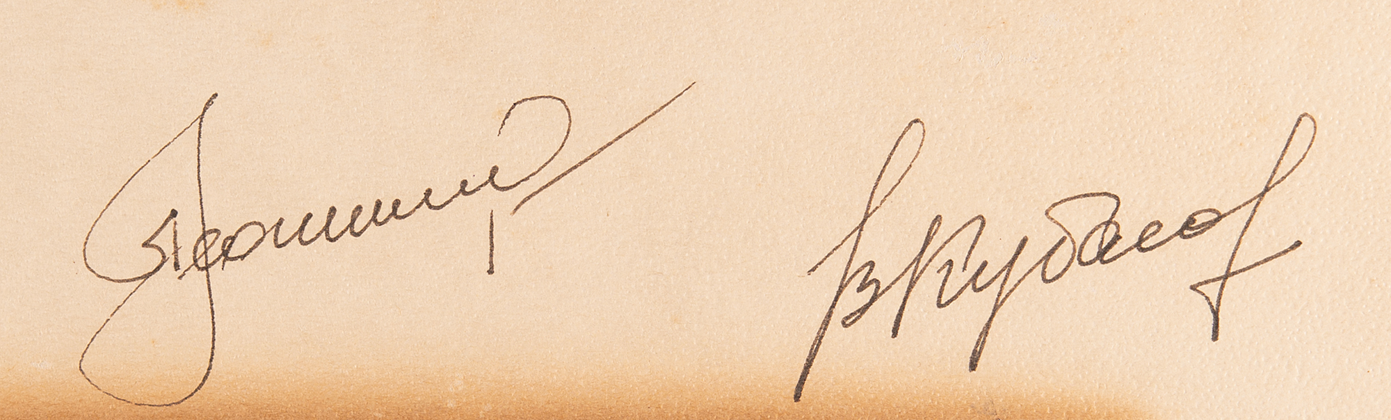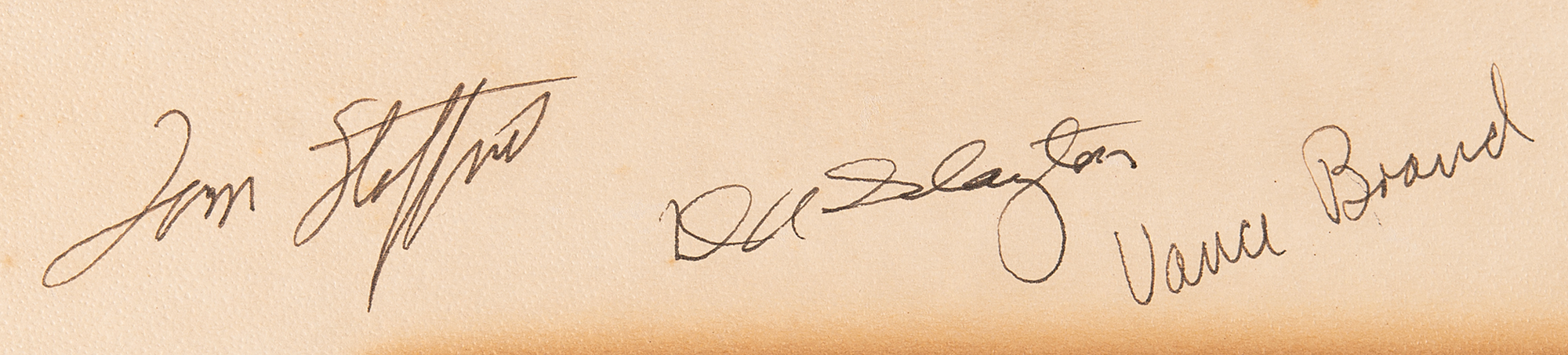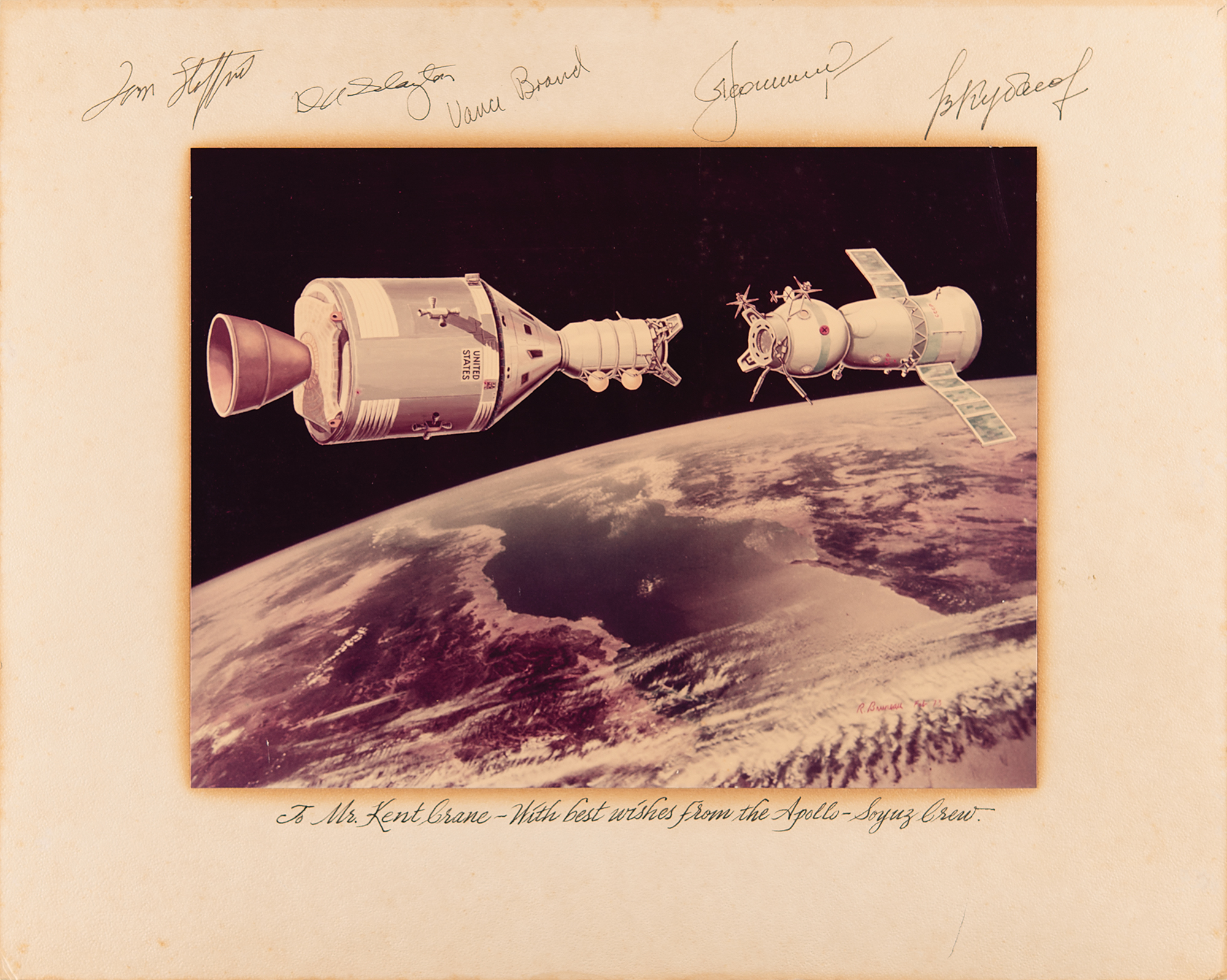Official color semi-glossy 13.75 x 10.5 NASA photo of an artistic depiction of the docking of the Apollo spacecraft and the Soviet Soyuz capsule during the Apollo–Soyuz Test Project, affixed to its original 20 x 16 cardstock mount, which is signed in black felt tip by astronauts Tom Stafford, Vance Brand, and Deke Slayton, and by cosmonauts Alexei Leonov and Valeri Kubasov. The lower border bears a calligraphic inscription: “To Mr. Kent Crane – With best wishes from the Apollo-Soyuz Crew.” In very good to fine condition, with scattered light foxing, toning, and soiling to the mount.