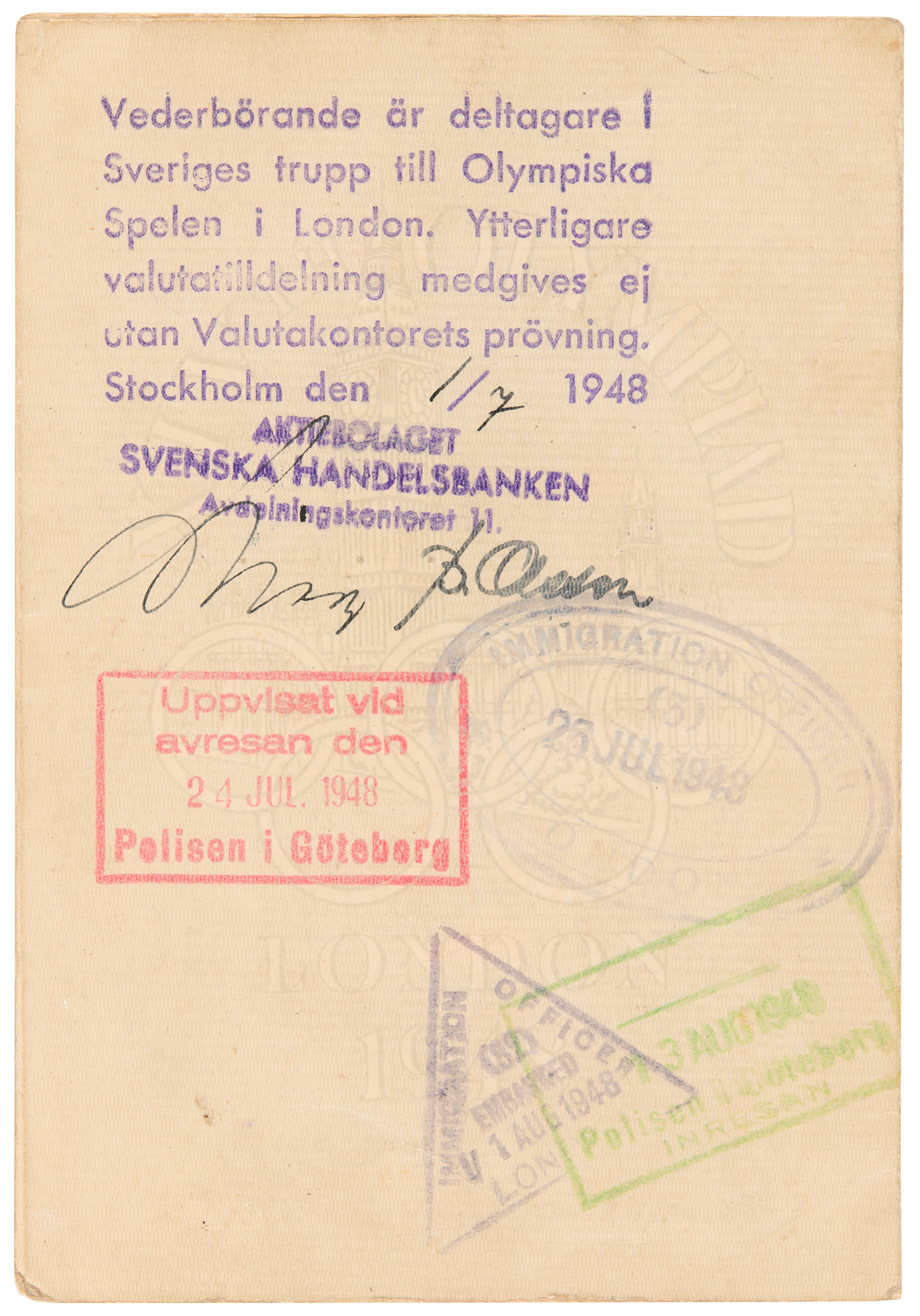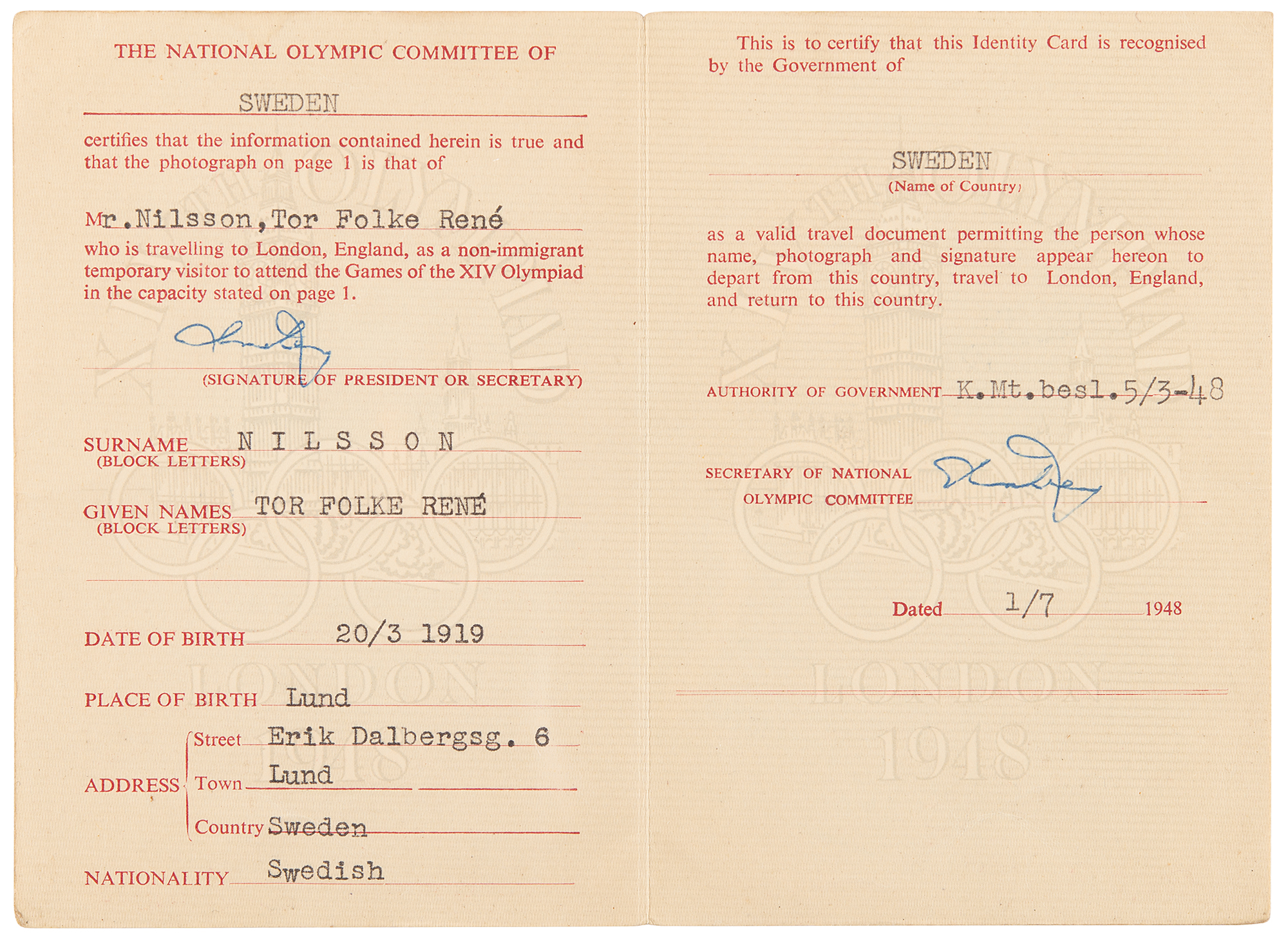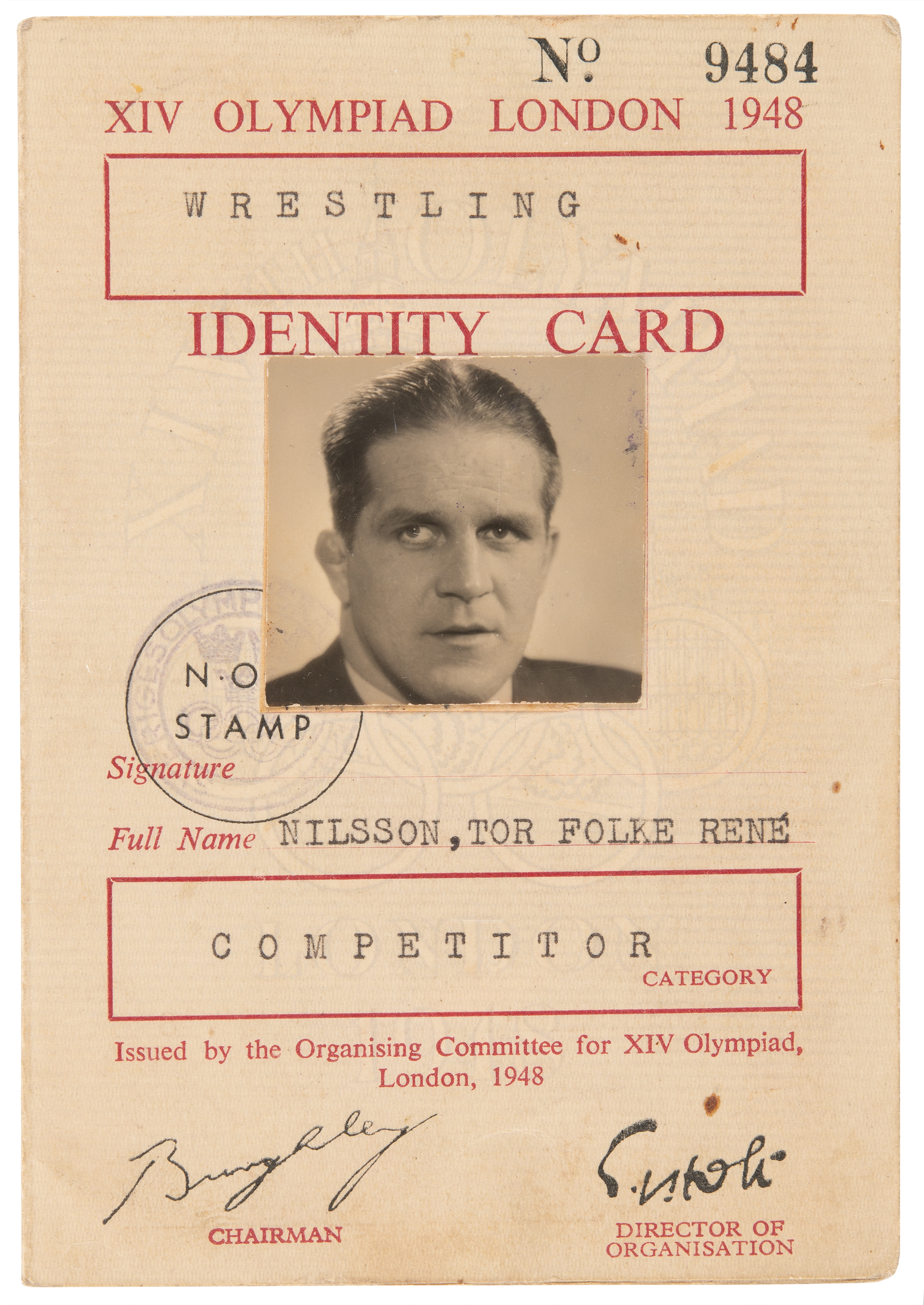 Official ‘Competitor’ identity card from the London 1948 Summer Olympics, issued to Swedish wrestler Tor Nilsson, who won a silver medal in the Greco-Roman wrestling heavyweight division at the 1948 Summer Games. The ID card, four pages, 3.75 x 5.5, dated July 11, 1948, numbered 9484, features Nilsson’s photo affixed to the front page, and the inner pages filled out in type with Nilsson’s personal information. In fine condition. Accompanied by other ephemera related to Nilsson.