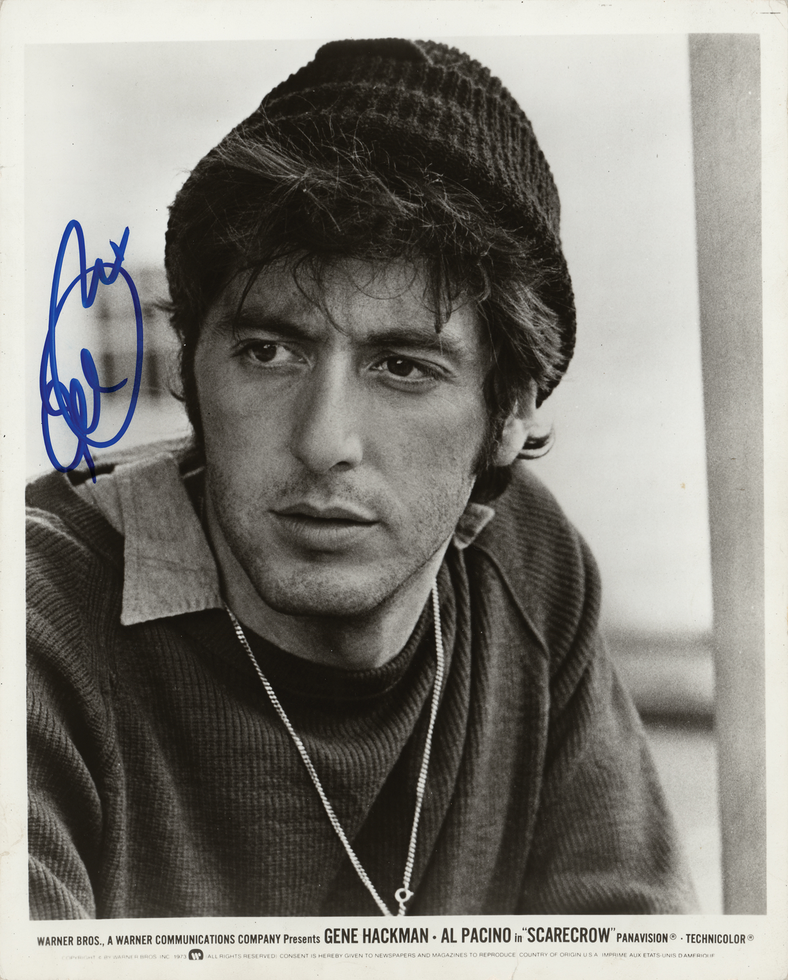 Glossy 8 x 10 Warner Bros publicity photo Francis Delbuchi in the 1973 comedy Scarecrow, signed in blue felt tip by Al Pacino. In fine condition, with scattered small surface impressions.