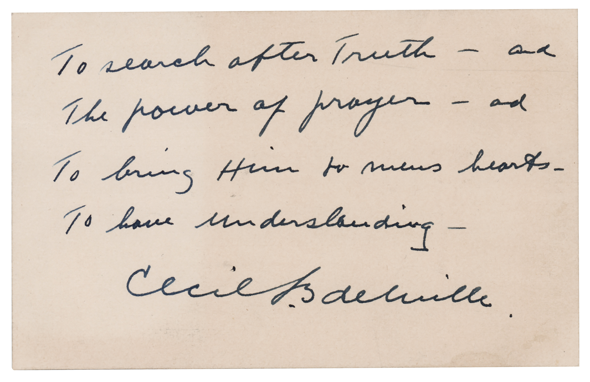 AQS signed "Cecil B. DeMille," on an off-white 5.25 x 3.25 card, in full: "To search after truth – and the power of prayer – and to bring Him to new hearts – to have understanding – Cecil B. DeMille." In very fine condition.