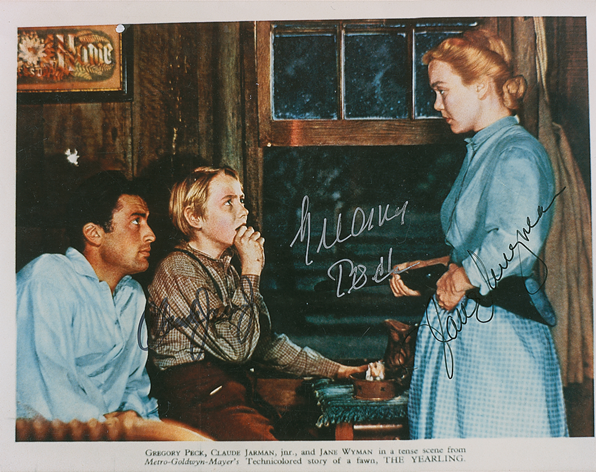 Color glossy 10 x 8 photo of a promotional photo for The Yearling, signed in silver ink by Gregory Peck and in black felt tip by Claude Jarman, Jr., and Jane Wyman. In fine condition, with some light contrast to Jarman's signature and small area of surface loss to top edge.