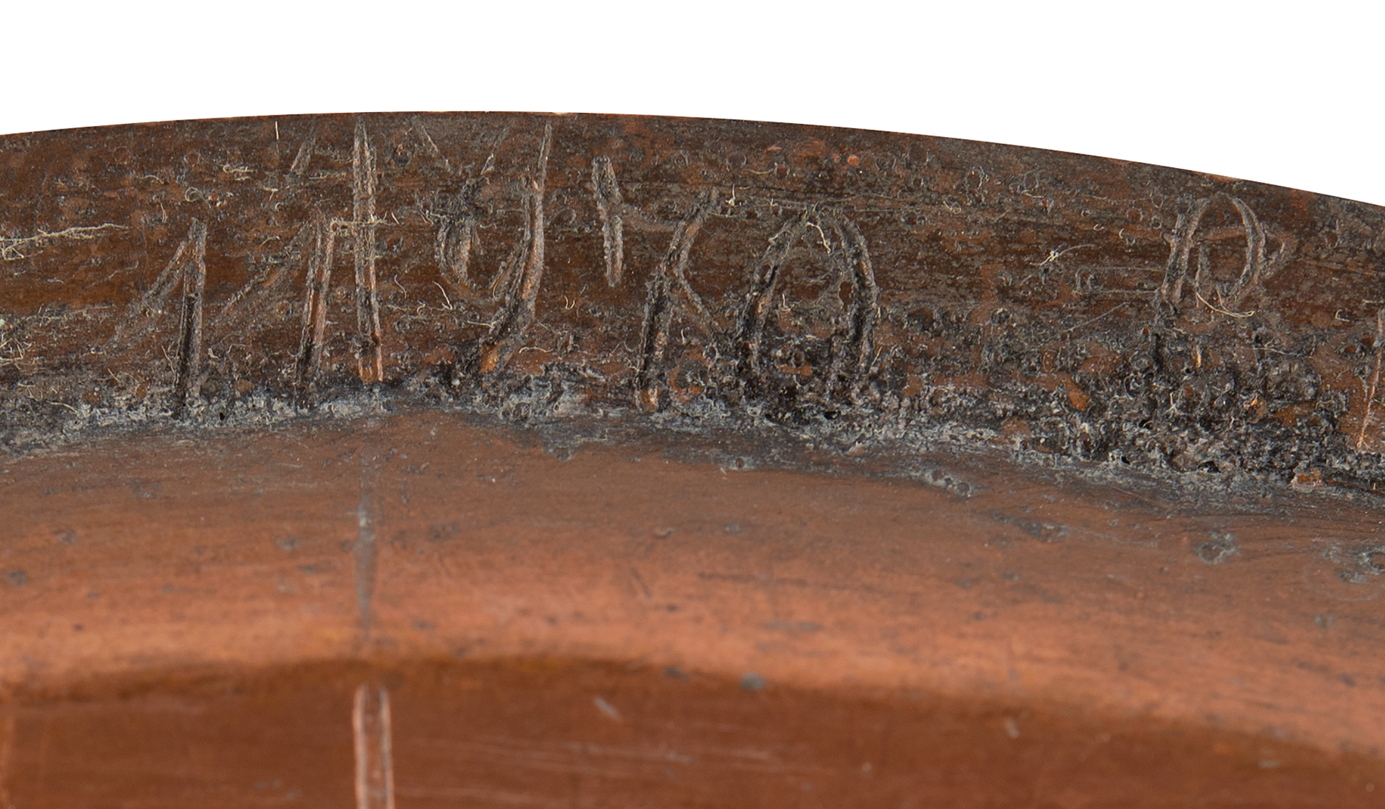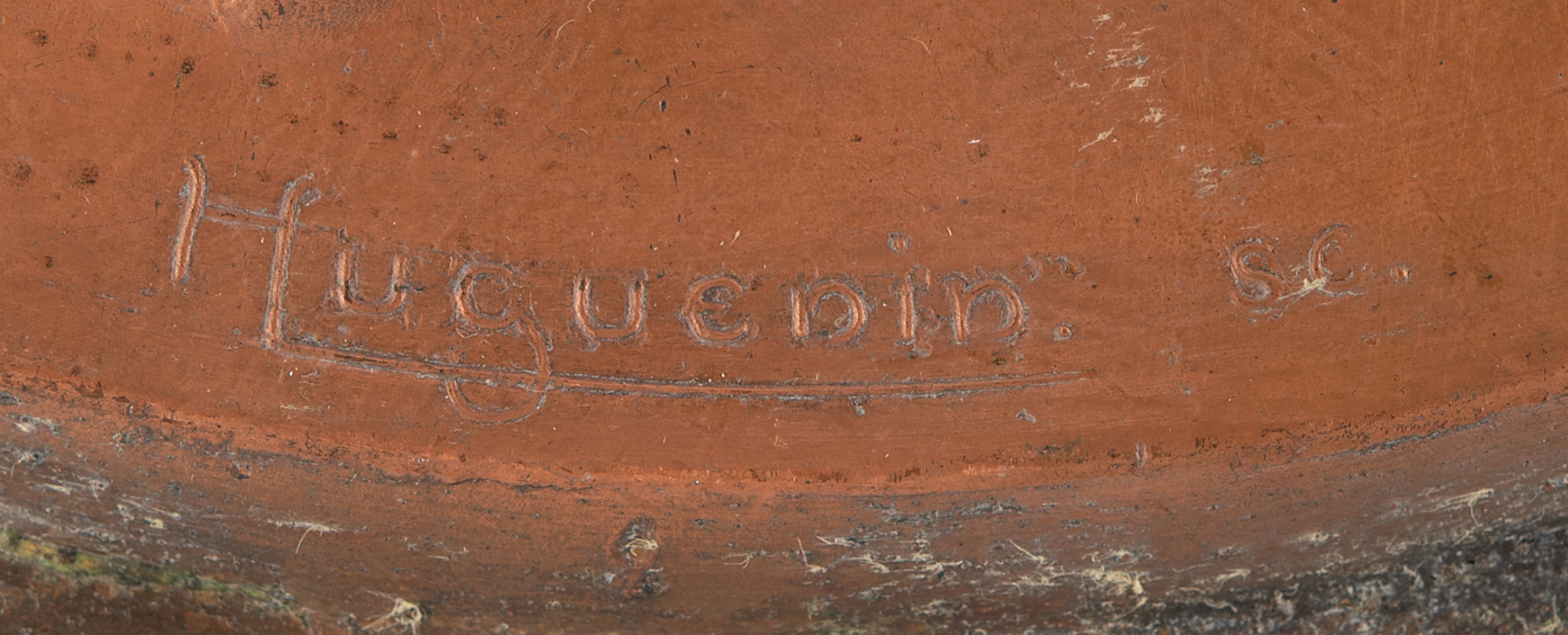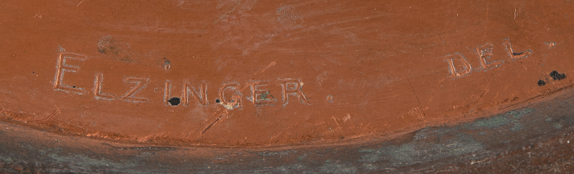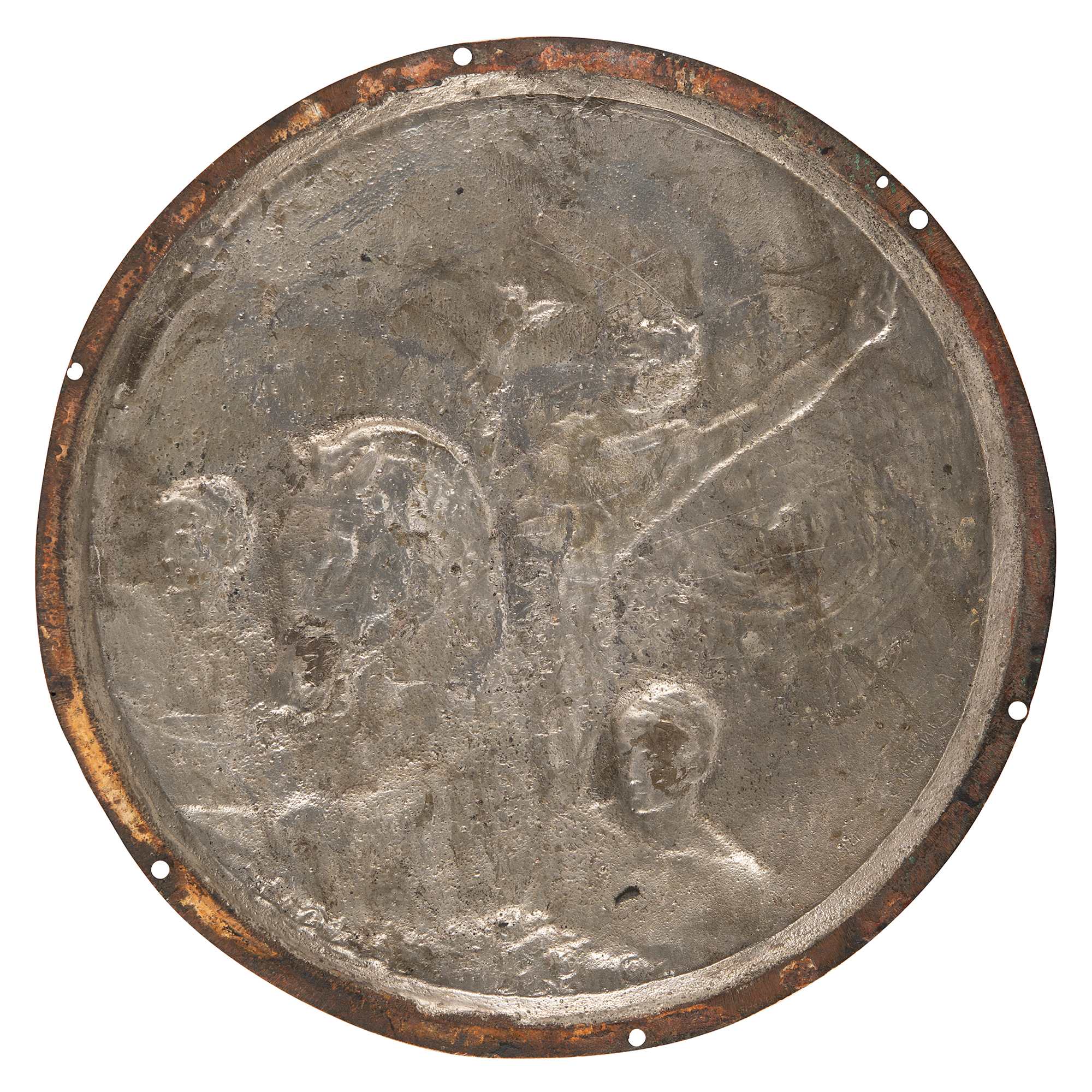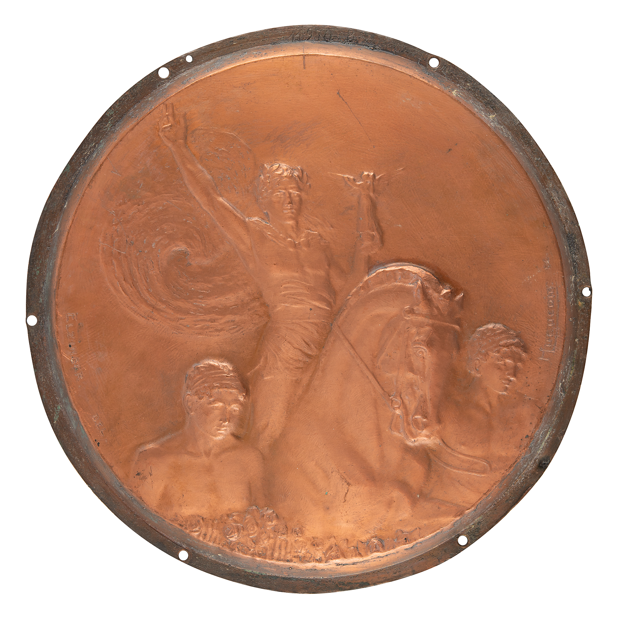 Oversized copper manufacturer's galvano for the 1915 medal minted by Huguenin to commemorate the installation of the International Olympic Committee at Lausanne in April 1915, measuring 11˝ in diameter, portraying an ancient Greek champion on horseback, led by two young men. The plate features the artist's name toward the rim on the left, "Elzinger," and the manufacturer's name, "Huguenin," on the right.