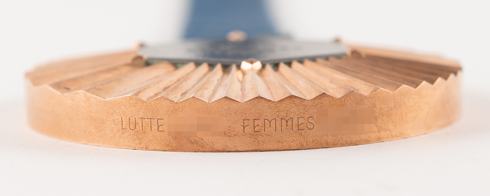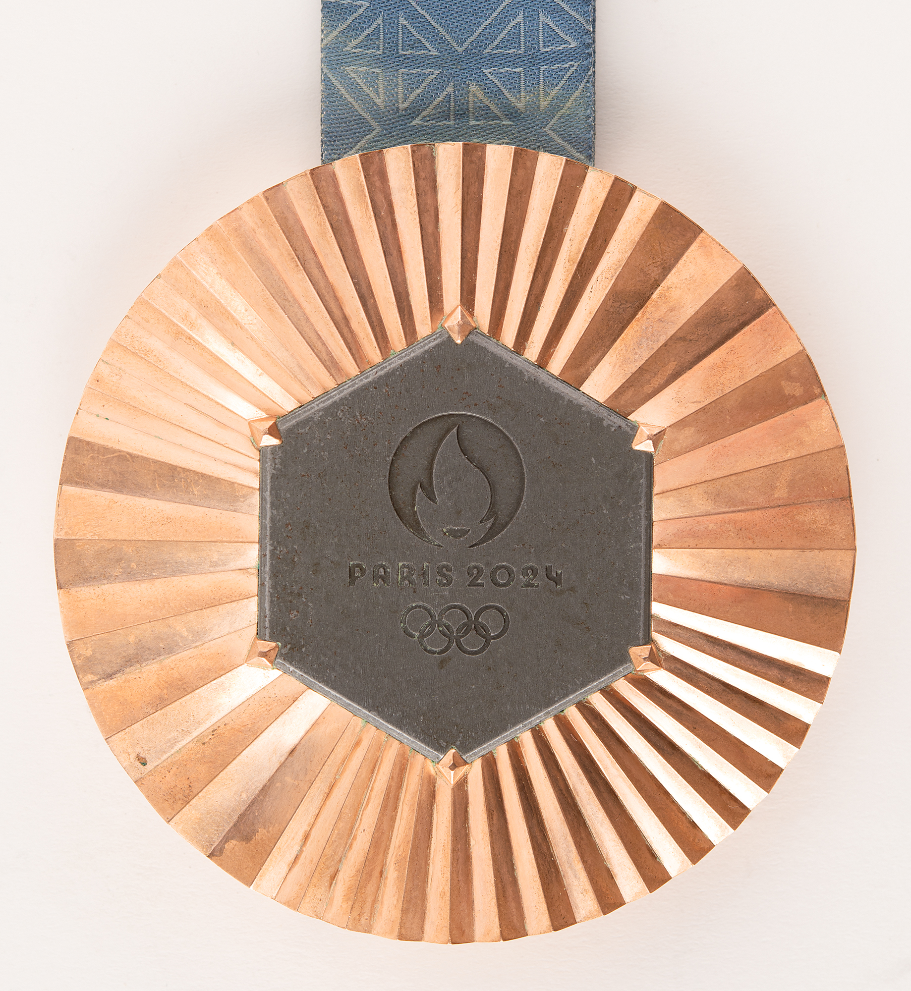 Fabulous bronze winner’s medal awarded in women's wrestling at the Paris 2024 Summer Olympics. Bronze, 85 mm, 455 gm, designed by the House of Chaumet/LVMH and manufactured by the Paris Mint. The front of the medal features an inlaid hexagonal piece of original 'puddle iron' from the Eiffel Tower in a Chaumet-inspired claw setting, engraved with the Paris 2024 emblem at center, surrounded by radiant ridges creatively representing the radiance of France and the athletes of the 2024 Games; the reverse boasts a traditional image of the Greek goddess of Victory, Nike, over the Panathenaic Stadium, with "Jeux de la XXXIII Olympiade - Paris 2024" overhead. Inscribed along the bottom edge with the name of the women's wrestling event for which it was awarded. Complete with its original dark blue silk ribbon, featuring a design motif of the crosspieces of the Eiffel Tower. A remarkable, iconic prize medal from the unforgettable Paris 2024 Summer Olympics.
