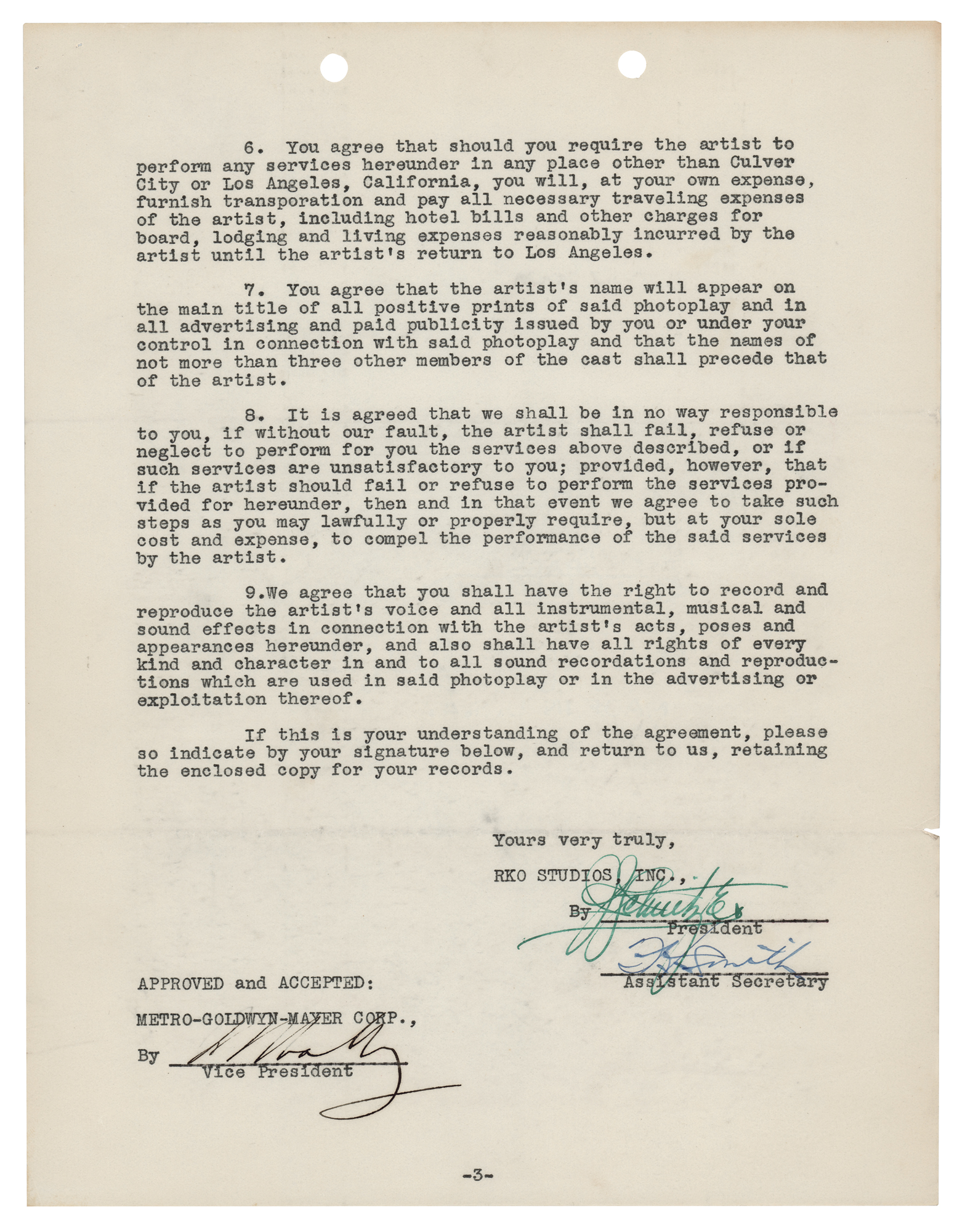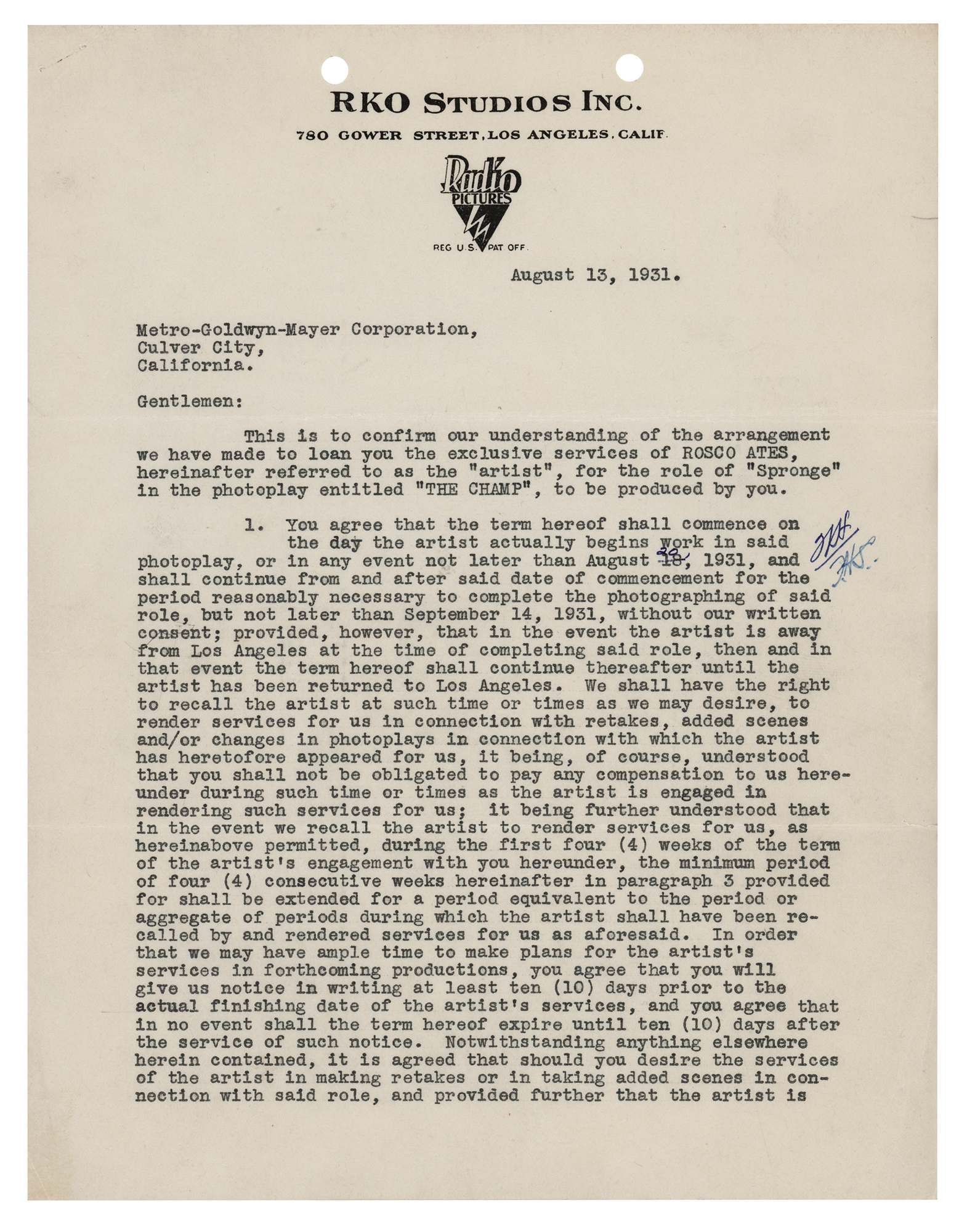 Contract between RKO Studios and Metro-Goldwyn-Mayer, three pages, 8.5 x 11, August 13, 1931, signed at the conclusion in black ink by MGM Vice President Irving Thalberg, and countersigned by RKO President Joseph I. Schnitzer; the document relates to RKO’s agreement to loan Rosco Ates to MGM for the Oscar-winning film The Champ.