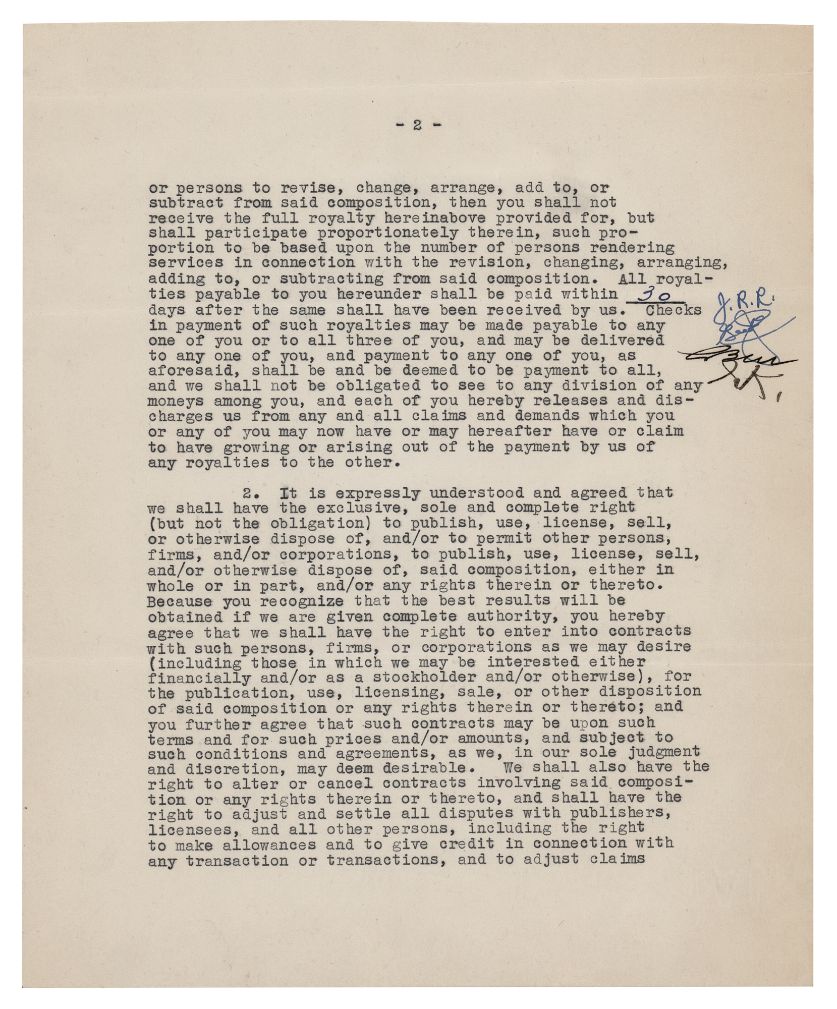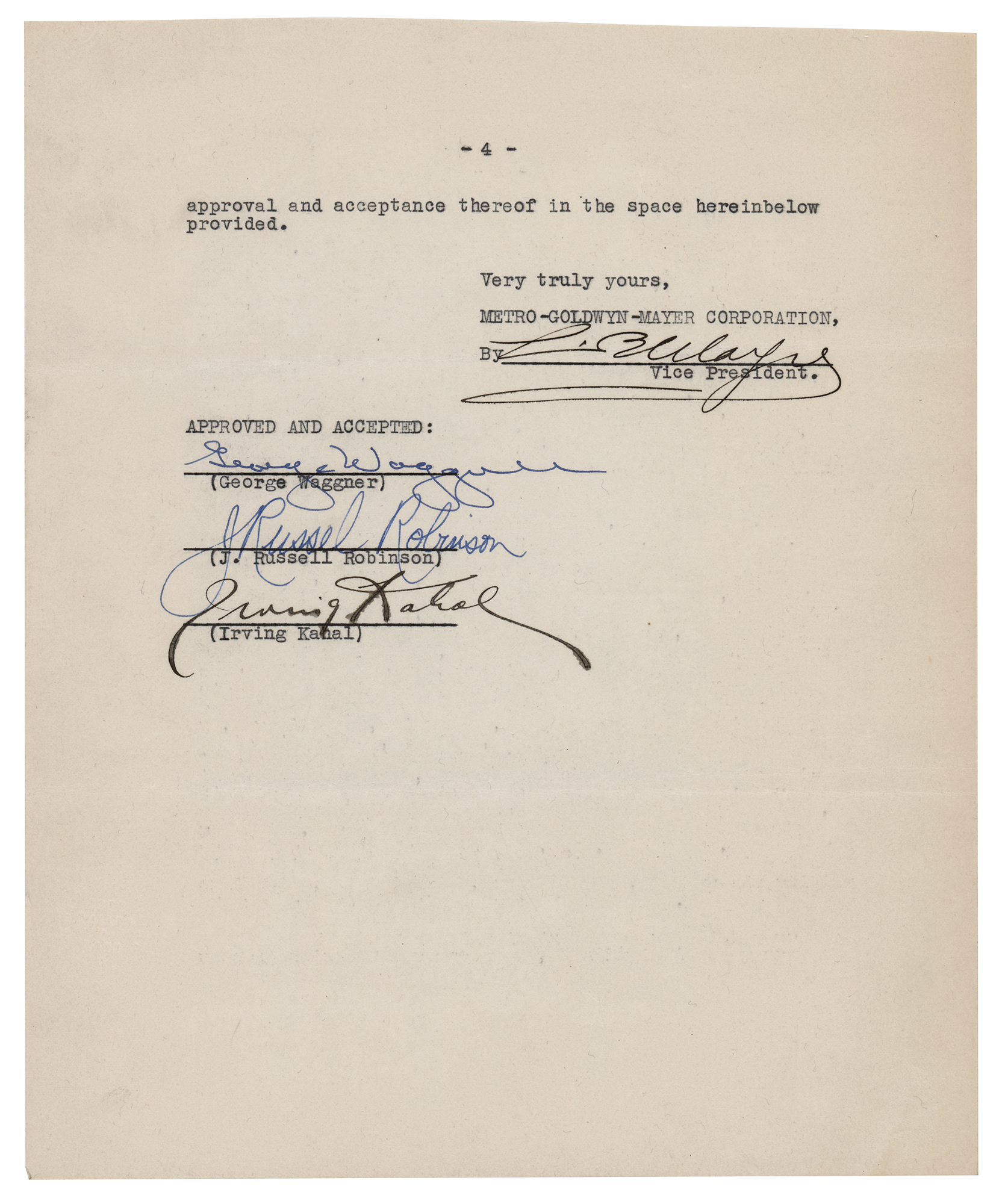 Contract between MGM and songwriters George Waggner, J. Russell Robinson, and Irving Kahal, four pages, 8.5 x 10.25, December 30, 1929, signed at the conclusion in black ink by Louis B. Mayer, and countersigned by the referenced songwriters; the contract is for the use of a song entitled ‘Just like Frankie and Johnnie.’