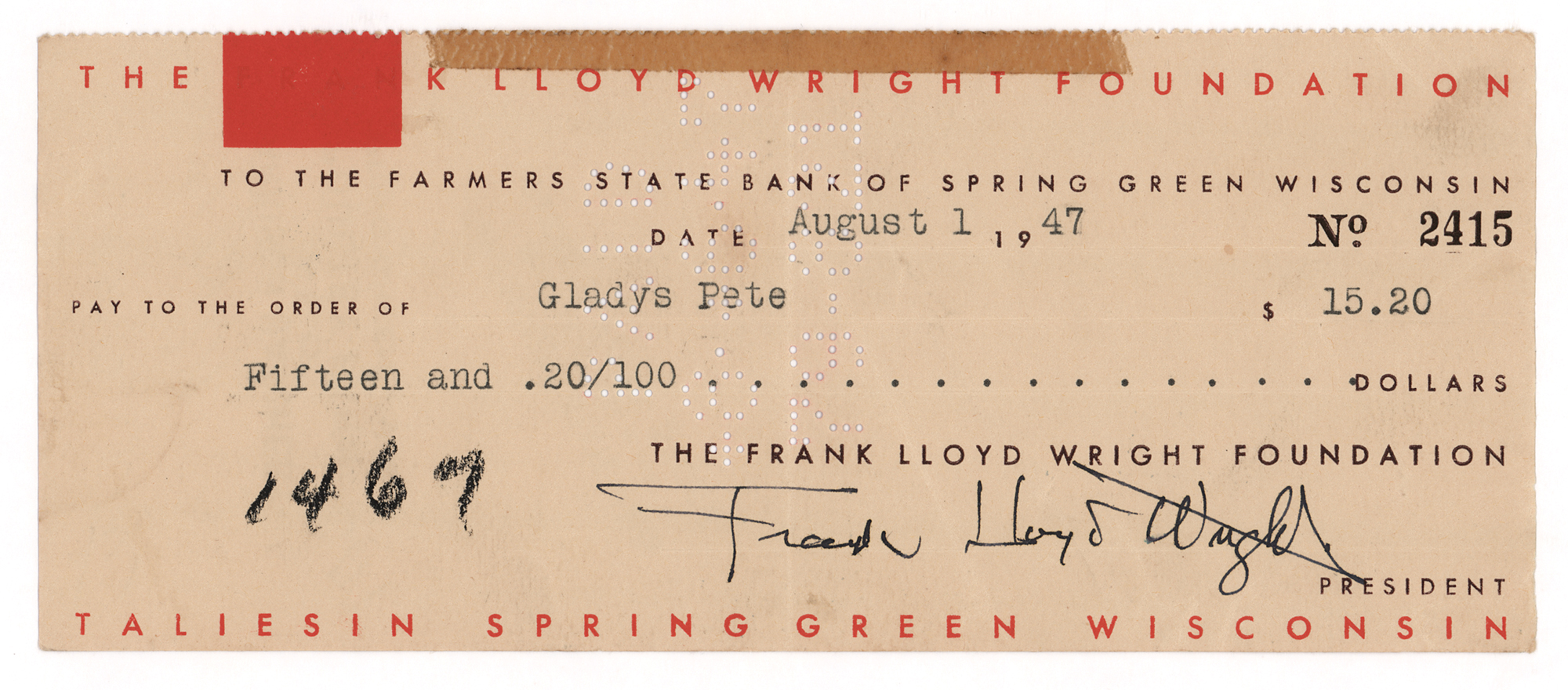 The Frank Lloyd Wright Foundation business check, 8 x 3.25, filled out in type and signed by Frank Lloyd Wright, payable to Gladys Pete for $15.20, August 1, 1947. In fine condition, with the usual thin strip of old tape along the top edge. Established by Wright in 1940, the Frank Lloyd Wright Foundation is dedicated to the preservation of Taliesin West in Scottsdale, Arizona, and Taliesin near Spring Green, Wisconsin.
