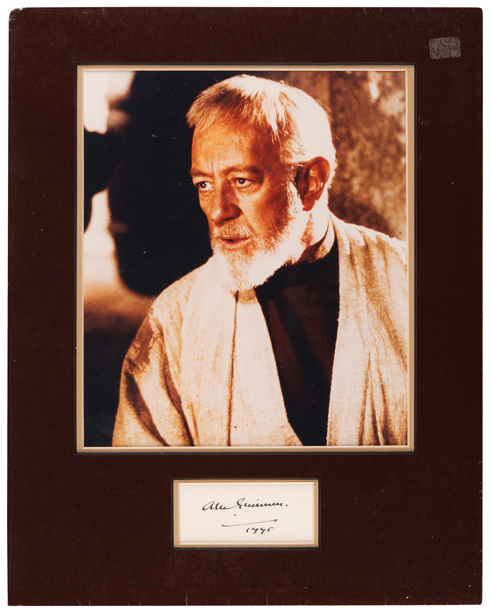 Ink signature, "Alec Guinness, 1995,” on a white 3.25 x 1.5 slip. Double-matted with a portrait of the actor in his Star Wars role as Obi-Wan Kenobi to an overall size of 11 x 14. In fine condition.