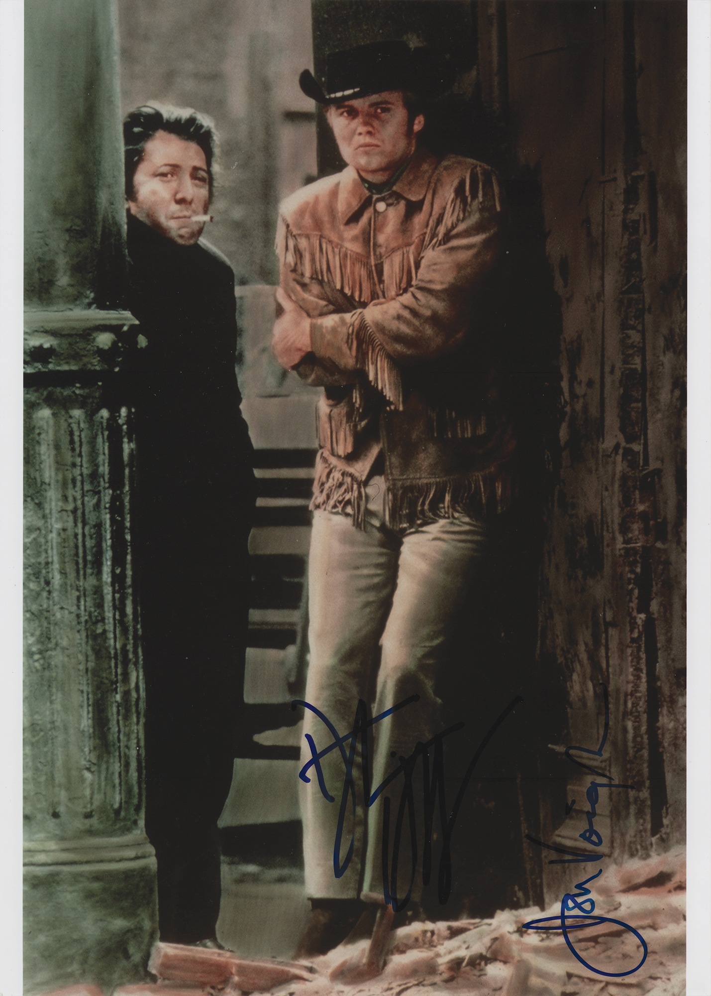 Glossy 10 x 14 photo from the 1969 Oscar-winning film Midnight Cowboy, signed in blue felt tip by Dustin Hoffman and Jon Voight. In fine condition, with a light bend to the lower right corner.
