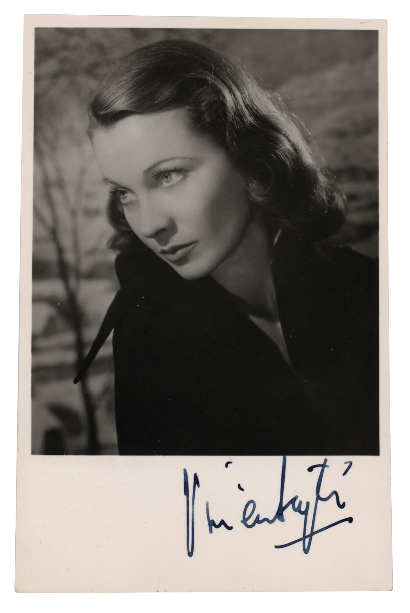 Vintage matte-finish 3.25 x 5.25 head-and-shoulders photo of Vivien Leigh, nicely signed in the lower margin in bold fountain pen. In fine condition, with a small crease to the lower right corner. Accompanied by an unsigned original 18-page program for MGM's 1939 film Gone With the Wind.