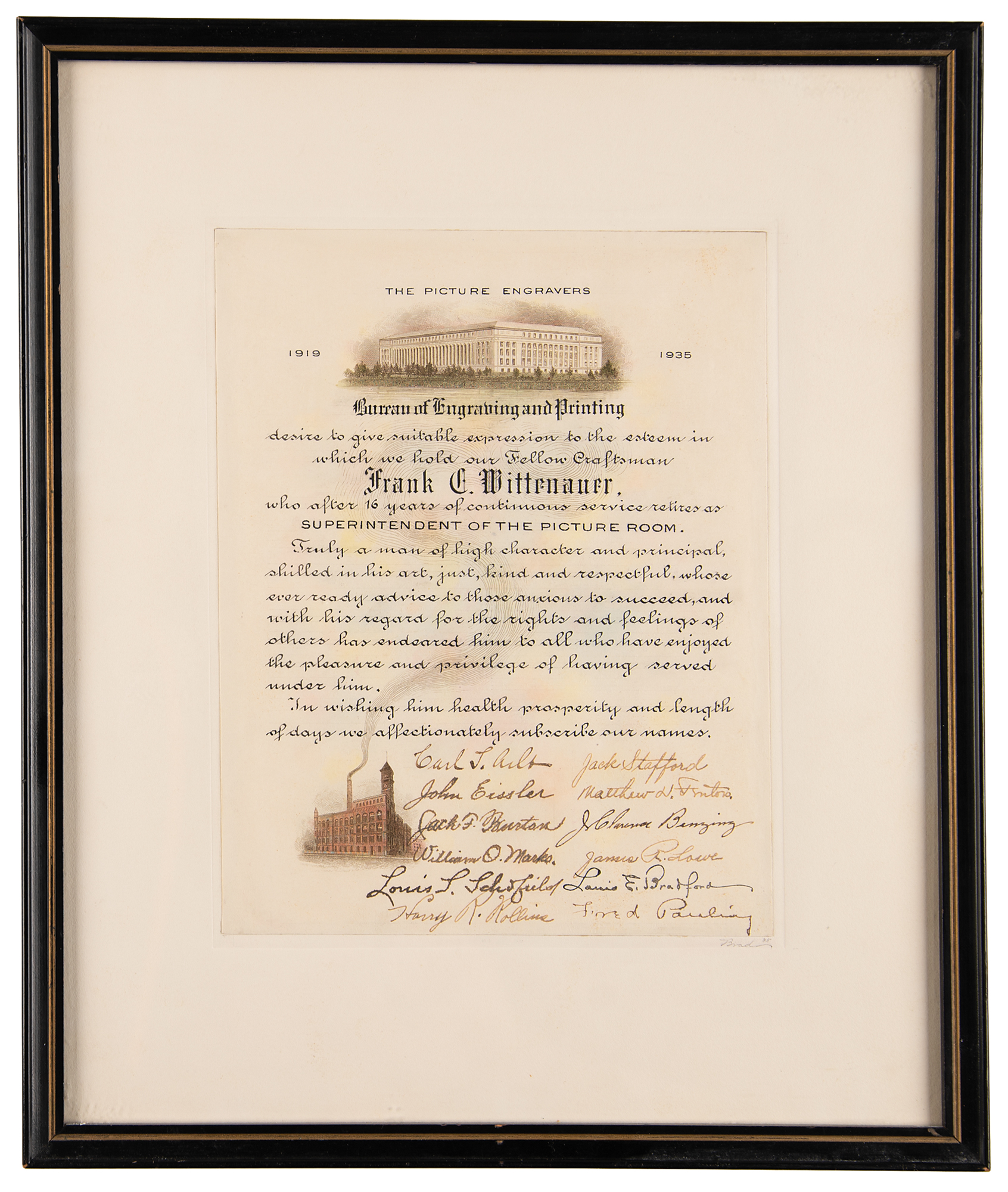 Uncommon printed certificate from ‘The Picture Engravers’ of the Bureau of Engraving and Printing, one page, 6.5 x 8.5, issued to “fellow craftsman Frank E. Wittenauer who after 16 years of continuous service retires as Superintendent of the Picture Room. Truly a man of high character and principal, skilled in his art, just, kind and respectful, whose ever ready advice to those anxious to succeed, and with his regard for the rights and feelings of others has endeared him to all who have enjoyed the pleasure and privilege of having served under him.” Signed at the conclusion in ink by 12 members of the Bureau of Engraving and Printing, including John Eissler, Louis S. Schofield, Henry R. Rollins, Jack Stafford, James R. Lowe, Louis E. Bradford, and more. Mounted and framed to an overall size of 11.5 x 13.75. In fine condition.