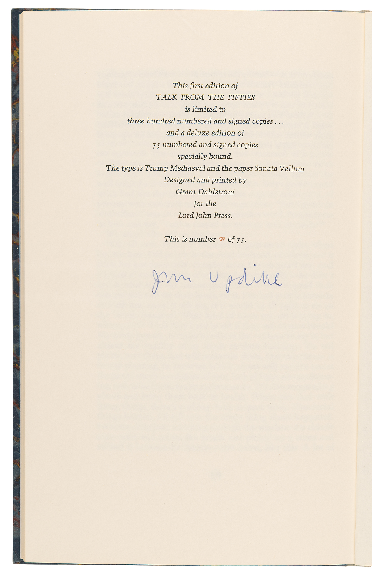 Signed book: Talk From the Fifties. First edition, limited issue, numbered 71/75. Northridge, CA: Lord John Press, 1979. Hardcover, 6.25 x 9.5, 63 pages. Signed on the colophon in blue ballpoint by John Updike. In very fine condition.