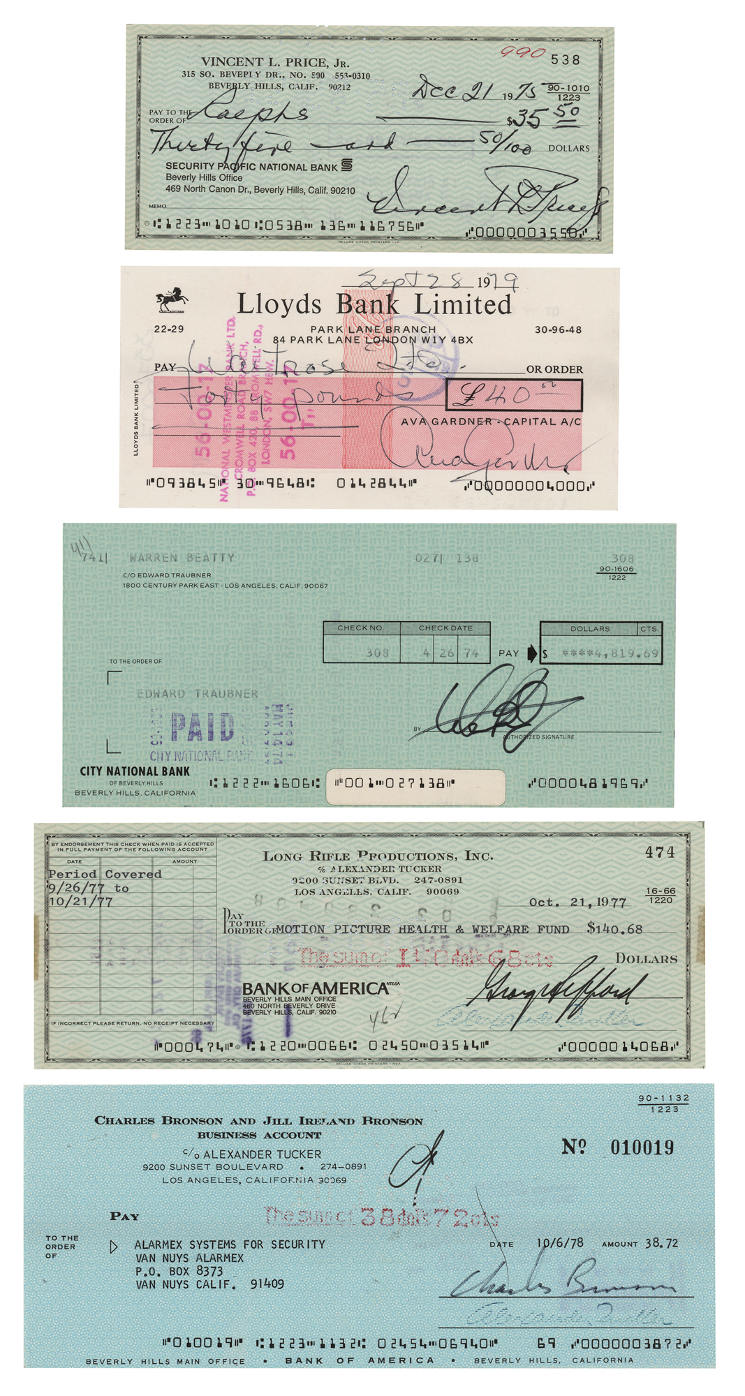 Five checks signed in ink or felt tip by a notable Hollywood actor or actress, dated between 1974 and 1979, ranging in size from 6 x 2.75 to 8.5 x 3.5, individually signed by the following celebrities: Warren Beatty, Charles Bronson, Ava Gardner, George Peppard, and Vincent Price. In overall fine condition.