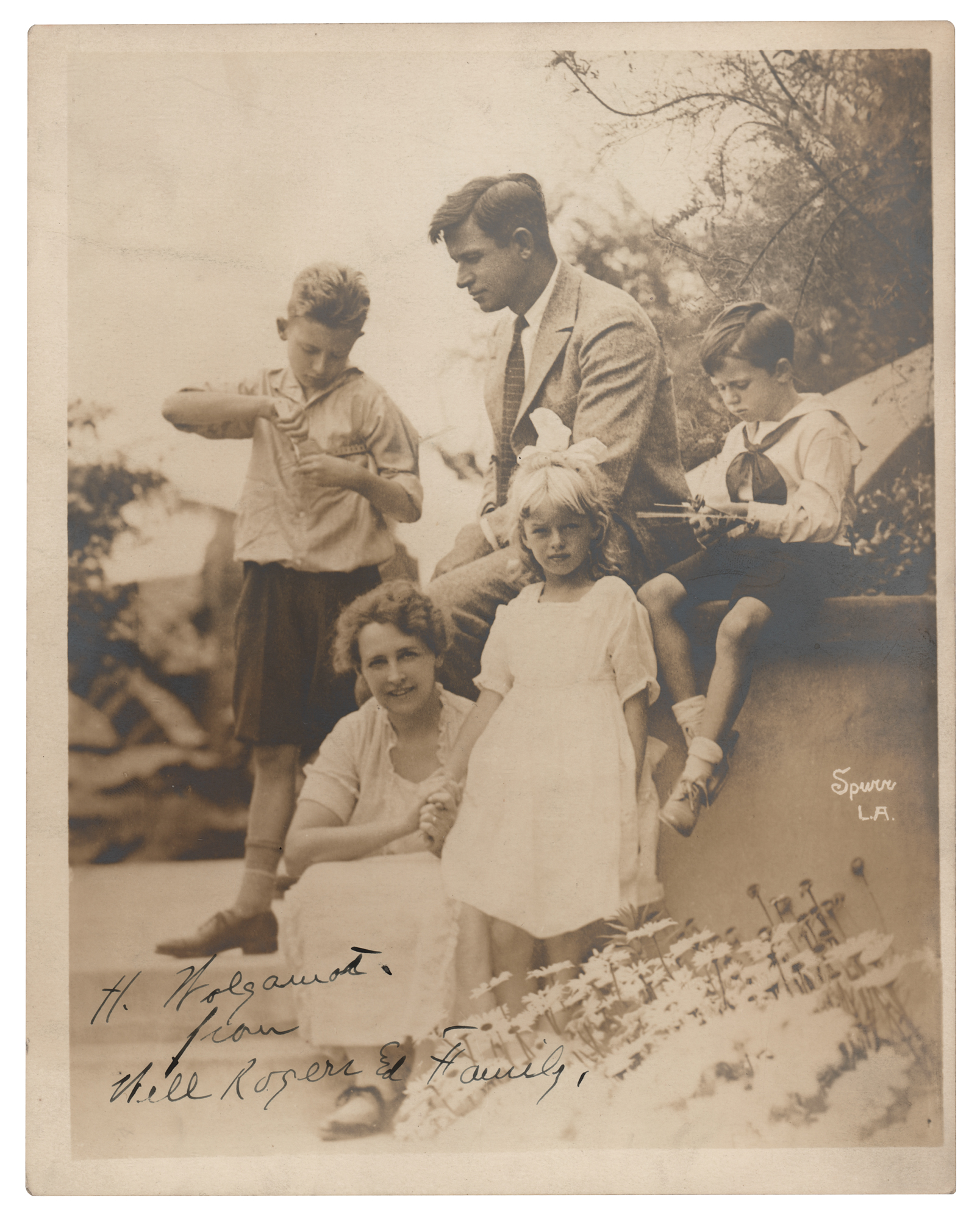 Vintage matte-finish 7.5 x 9.5 Spurr family portrait depicting Will Rogers in profile, his wife and daughter facing the camera and his sons otherwise occupied, signed and inscribed in fountain pen, "H. Wolgamont from Will Rogers & Family." In fine condition, with some minor creasing.