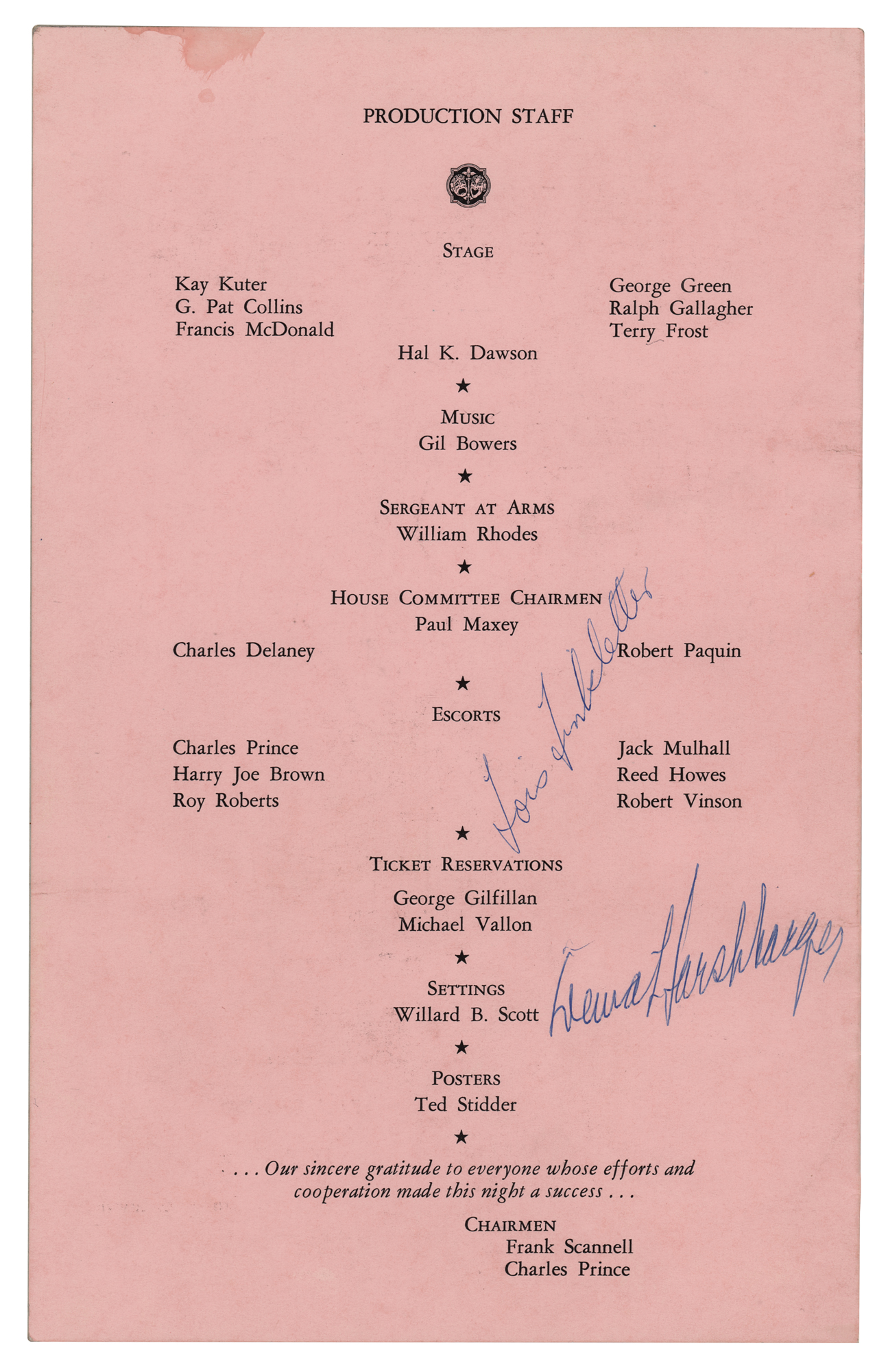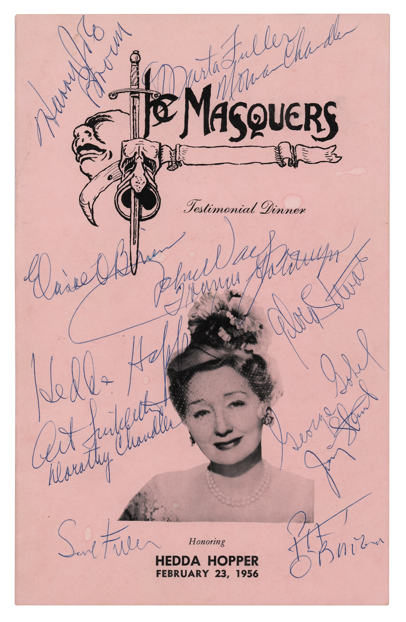 Program for a testimonial dinner by The Masquers honoring Hedda Hopper on February 23, 1956, two pages, 6.25 x 10, signed on the front cover in blue ballpoint by John Wayne, Jimmy Stewart, Hedda Hopper, Pat O'Brien, Eloise O'Brien, Art Linkletter, Harry Joe Brown, Norman Chandler, Dorothy Chandler, Sam Fuller, Marta Fuller, Frances Goldwyn, George Gobel, and others. In fine condition.