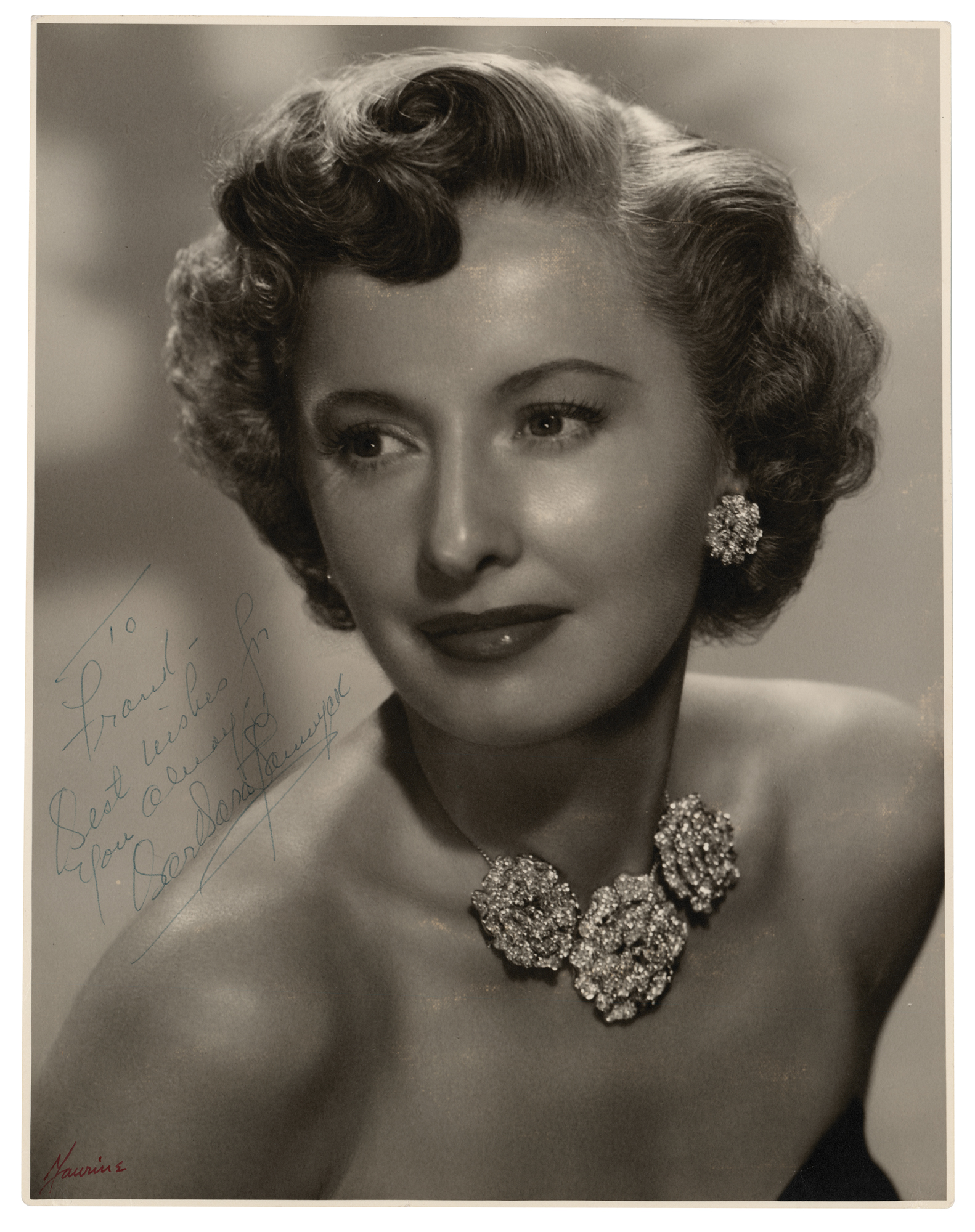 Vintage matte-finish 10.75 x 13.5 close-up photo of Stanwyck in a dazzling necklace, signed and inscribed in blue ballpoint, "To Frank, best wishes for your always, Barbara Stanwyck.” Reverse bears a stamp crediting the photograph to Maurine. In fine condition. From the David Seltzer collection.