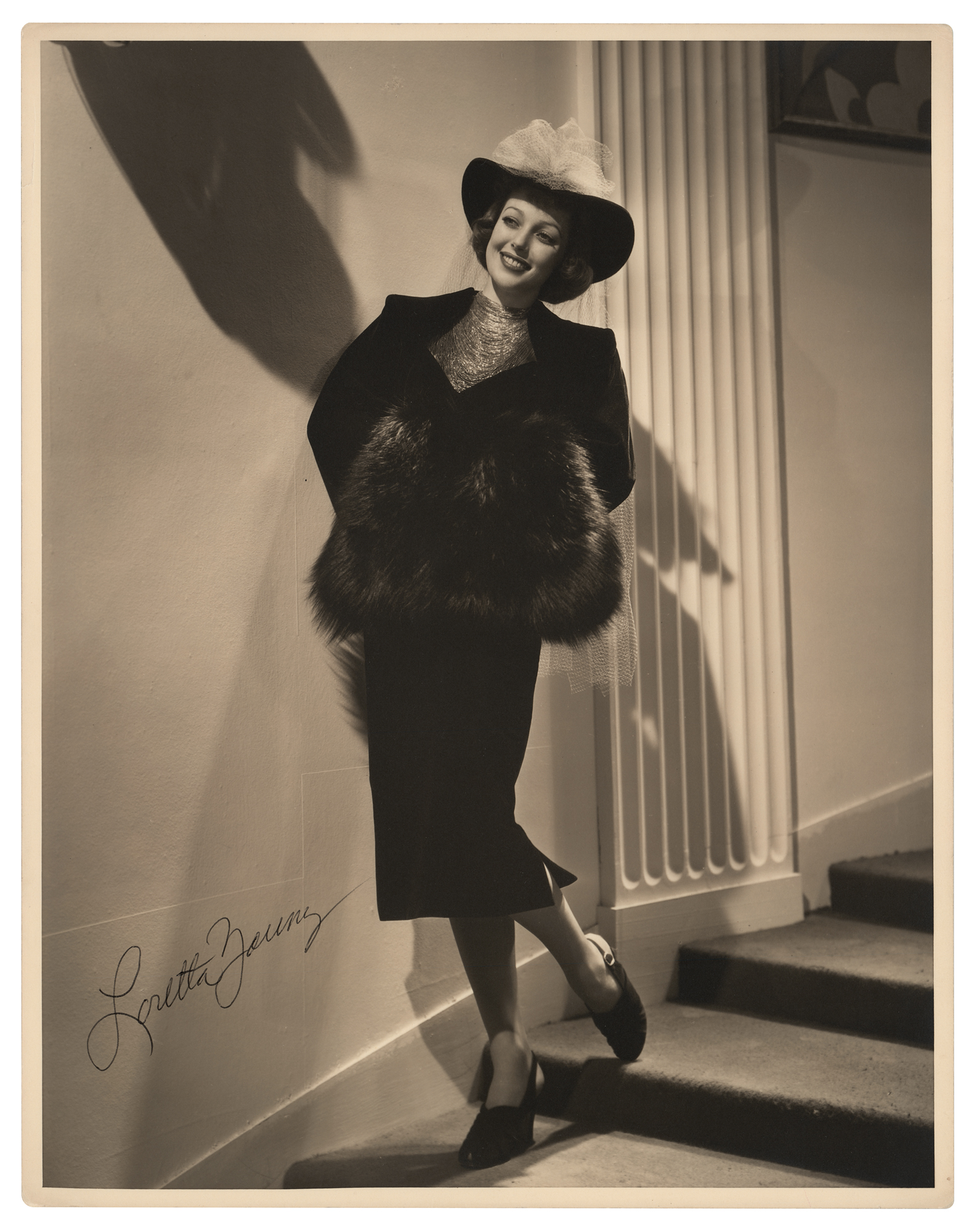 Vintage matte-finish 11 x 14 photo of Loretta Young in a sophisticated black outfit, signed in black ballpoint. In very fine condition. From the David Seltzer collection.