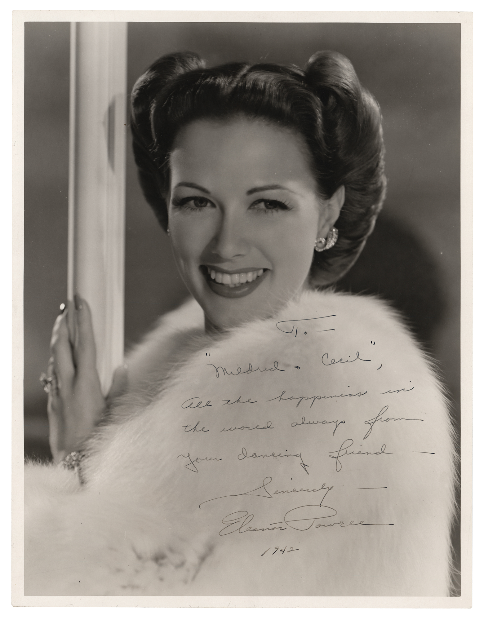 Vintage matte-finish 10 x 13 glamour portrait of Powell in white fur, signed and inscribed in fountain pen, "To 'Mildred & Cecil,' see the happiness in the world always from your dancing friend – Sincerely – Eleanor Powell, 1942.” In very fine condition. From the David Seltzer collection.