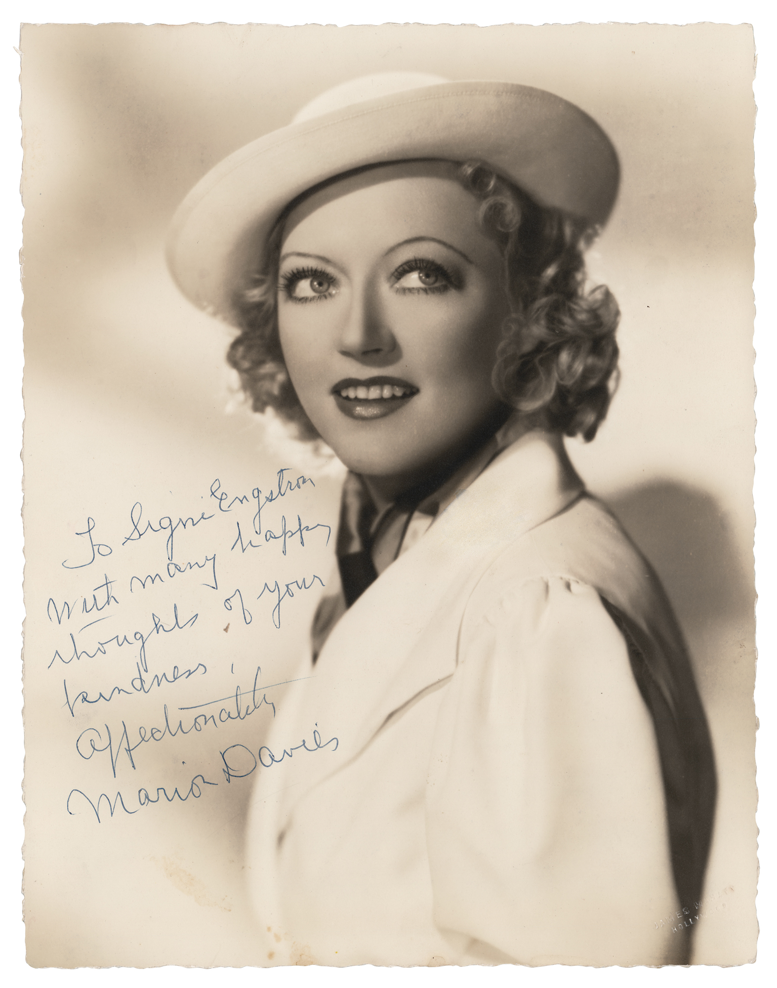 Vintage matte-finish 10.25 x 13.25 portrait of Davies in a white jacket and hat, signed and inscribed in blue ballpoint, "To Signi Engstrom, with many happy thoughts of your kindness, Marion Davies.” Blindstamped in the lower right corner crediting the photograph to James Manatt. In very fine condition. From the David Seltzer collection.