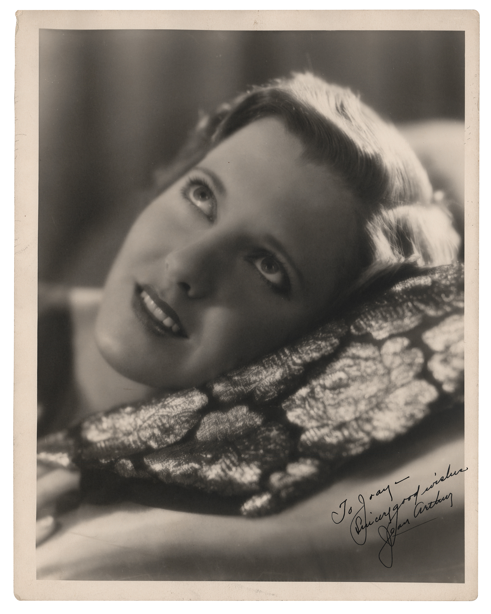 Vintage matte-finish 11 x 14 portrait of the Broadway and screen actress, signed and inscribed in fountain pen, "To Joan – sincerely good wishes, Jean Arthur.” In very fine condition. From the David Seltzer collection.