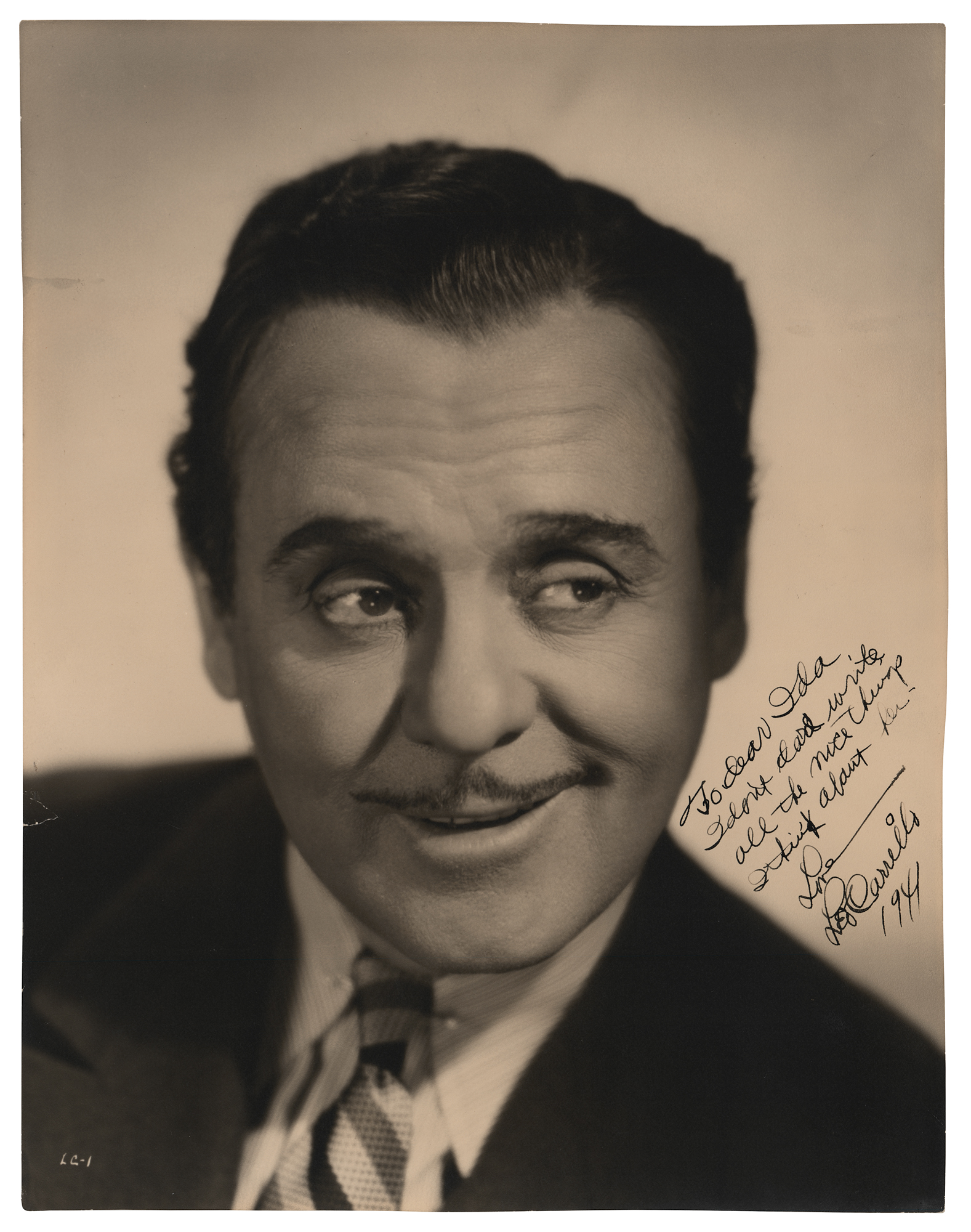American actor, vaudevillian, political cartoonist, and conservationist (1880-1961) known for his role as Pancho in the television series The Cisco Kid. Matte-finish 10.5 x 13.5 photo of Carrillo in a head-and-shoulders, signed and inscribed in fountain pen, "To dear Ida, I dare not write all the nice things I think about her – Love, Leo Carrillo, 1941.” In fine condition. From the David Seltzer collection.