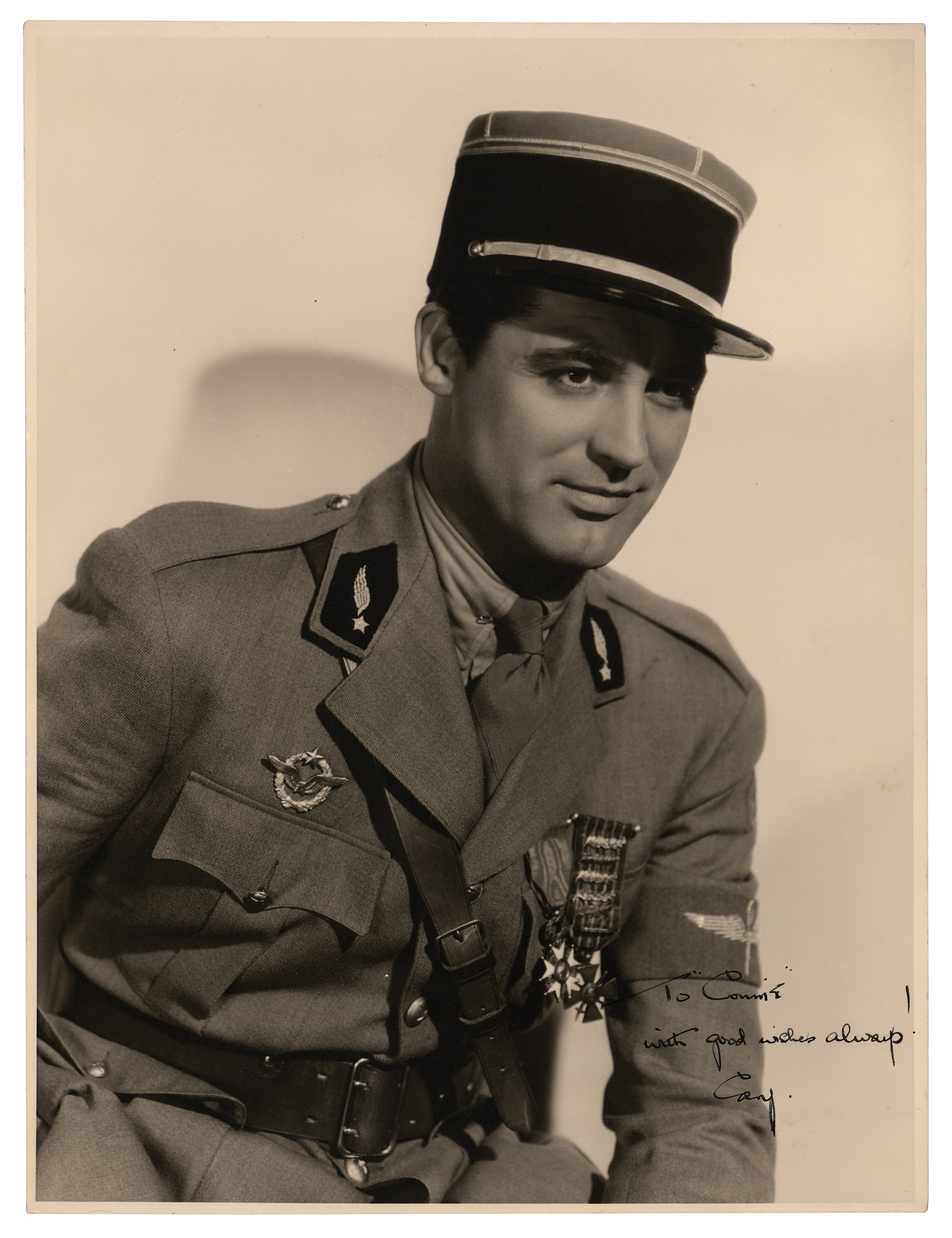 Vintage matte-finish 9.5 x 12.5 half-length photo of Cary Grant in a military uniform, signed and inscribed in fountain pen, "To Connie, with good wishes always! Cary.” Reverse bears a credit stamp attributing the photograph to MGM photographer Virgil Apger. In very fine condition. From the David Seltzer collection.
