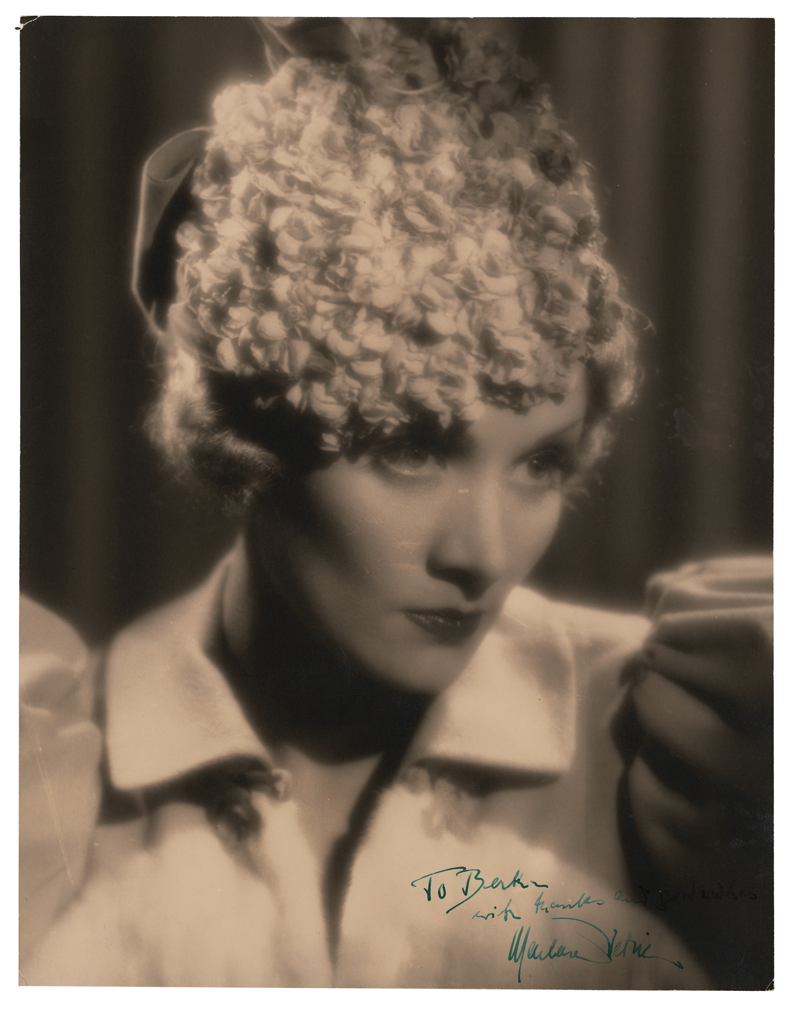 Vintage matte-finish 10.5 x 13.25 photo of the stage and screen actress, signed and inscribed in fountain pen, "To Burke, with thanks and good wishes, Marlene Dietrich.” In very fine condition, with some small ceases to the corner tips. From the David Seltzer collection.