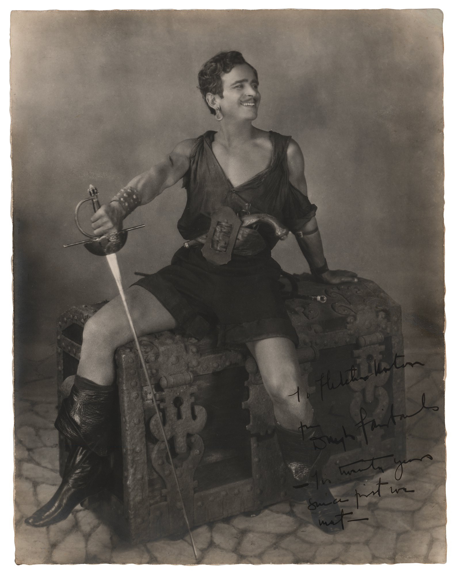 Vintage matte-finish 10.25 x 13.25 photo of Fairbanks in the 1926 adventure film The Black Pirate, signed and inscribed in fountain pen, "To Hutchins Norton, from Douglas Fairbanks – tis twenty years since first we met –.” In fine condition. From the David Seltzer collection.