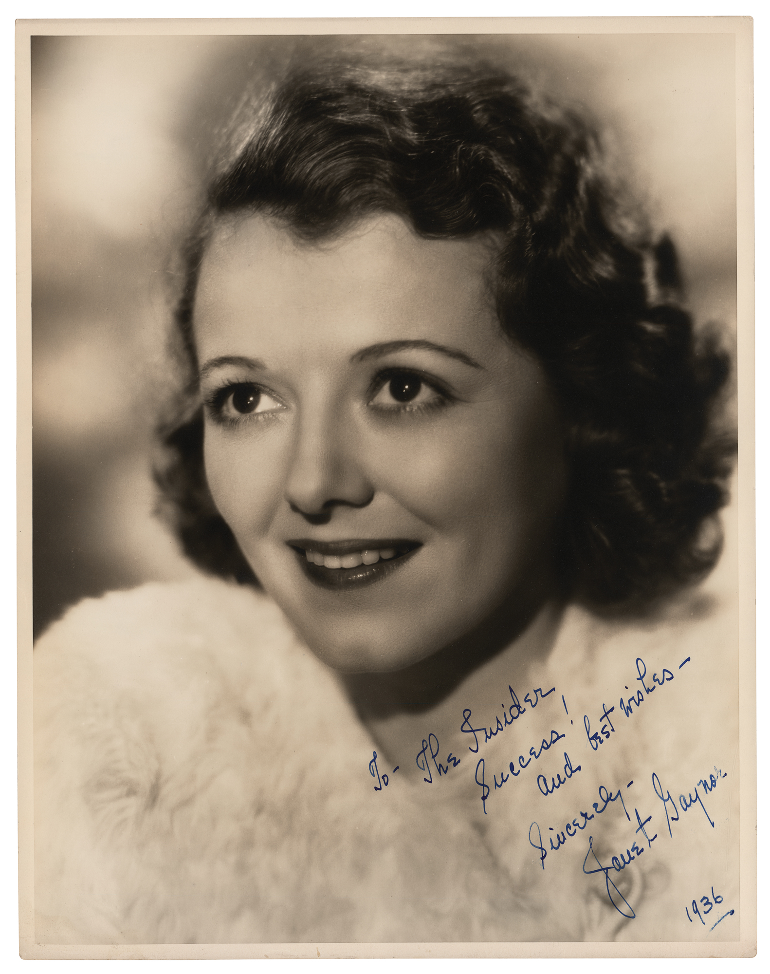American film, stage and television actress (1906-1984) known as the first recipient for the Academy Award for Best Actress for her performances in three films: 7th Heaven, Sunrise: A Song of Two Humans, and Street Angel. Matte-finish 11 x 14 portrait of the young actress, signed and inscribed in fountain pen, "To – The Insider, Success! and best wishes – Sincerely – Janet Gaynor, 1936". In fine condition. From the David Seltzer collection.