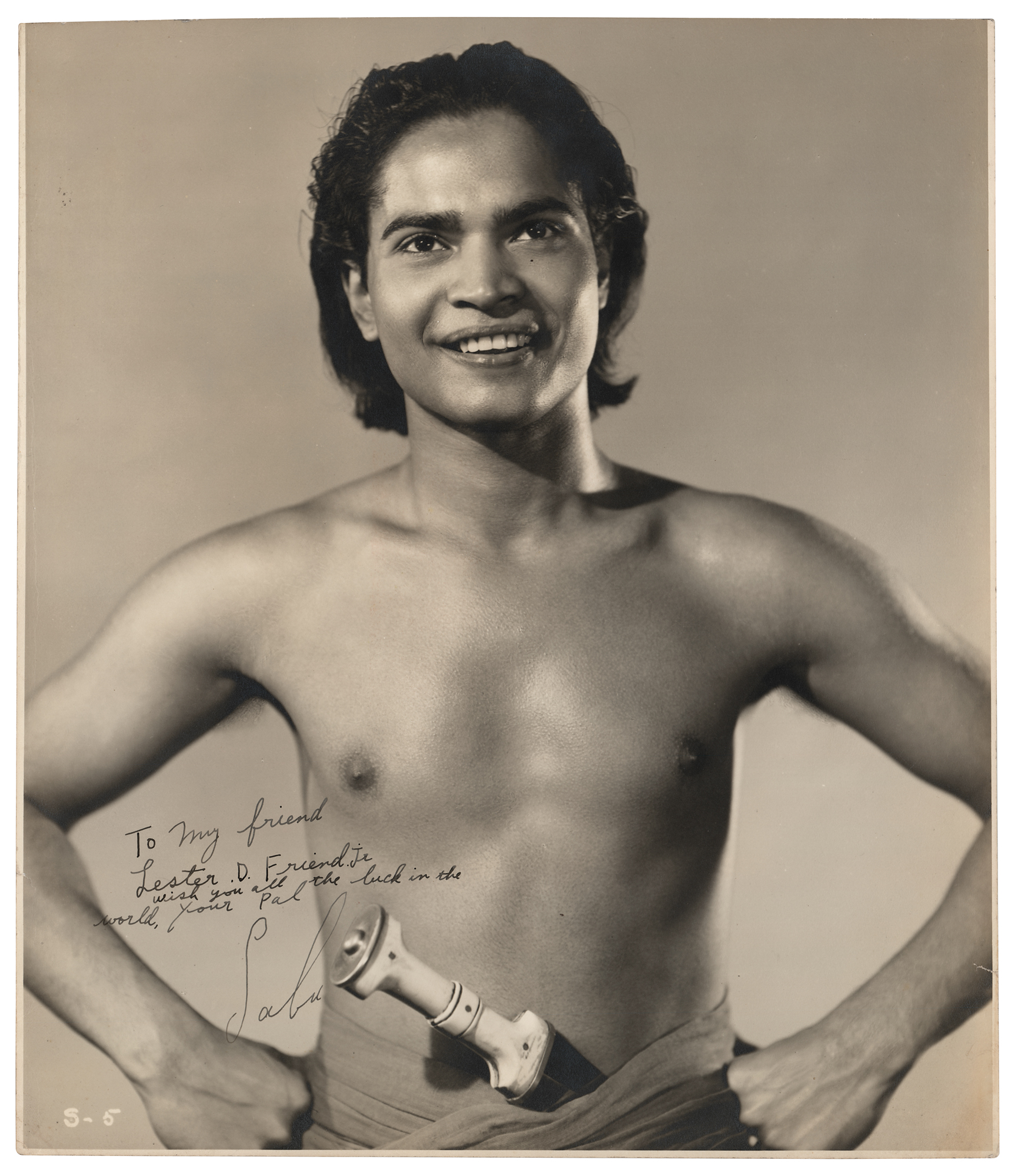 Indian actor (1924-1963) best known for his work in British and U.S. films in the 1930s and 1940s. Vintage matte-finish 10.5 x 12.25 half-length photo of Sabu as Mowgli in the 1942 film Jungle Book, signed and inscribed in fountain pen, "To my friend, Lester D. Friend, Jr., wish you all the luck in the world, your pal, Sabu.” In fine condition, with trimmed edges. From the David Seltzer collection.