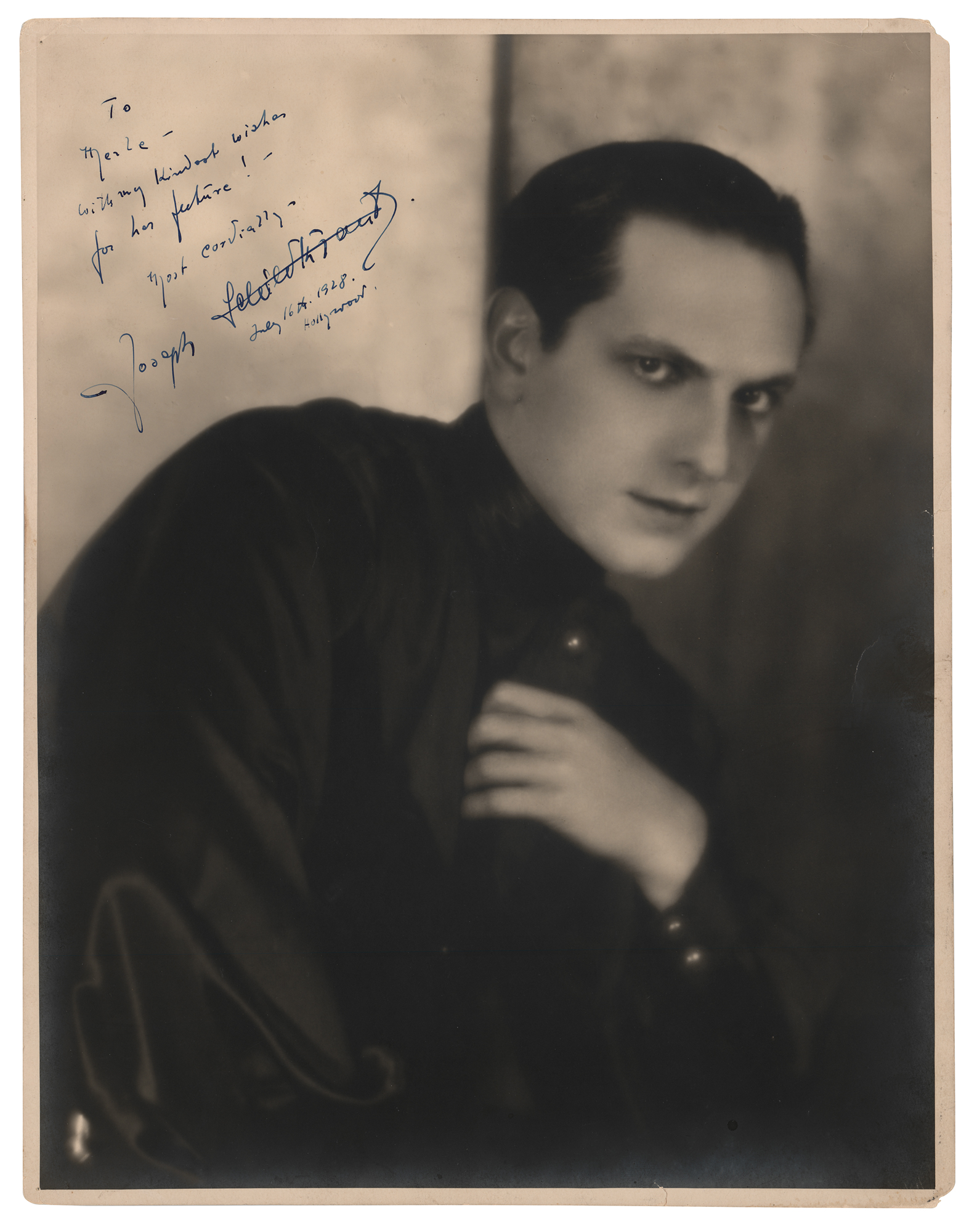 Viennese-born actor (1896–1964) who won an Academy Award for his role in the 1937 film The Life of Emile Zola. Vintage matte-finish 10.5 x 13.5 photo of the award-winning actor, signed and inscribed in fountain pen, "To Merle – with my kindest wishes for her future! – most cordially – Joseph Schildkraut. July 16th, 1928, Hollywood.” Reverse bears a credit stamp attributing the photograph to Harold Dean Carsey. In fine condition, with faint silvering, a tiny edge tear, and trivial corner loss. From the David Seltzer collection.