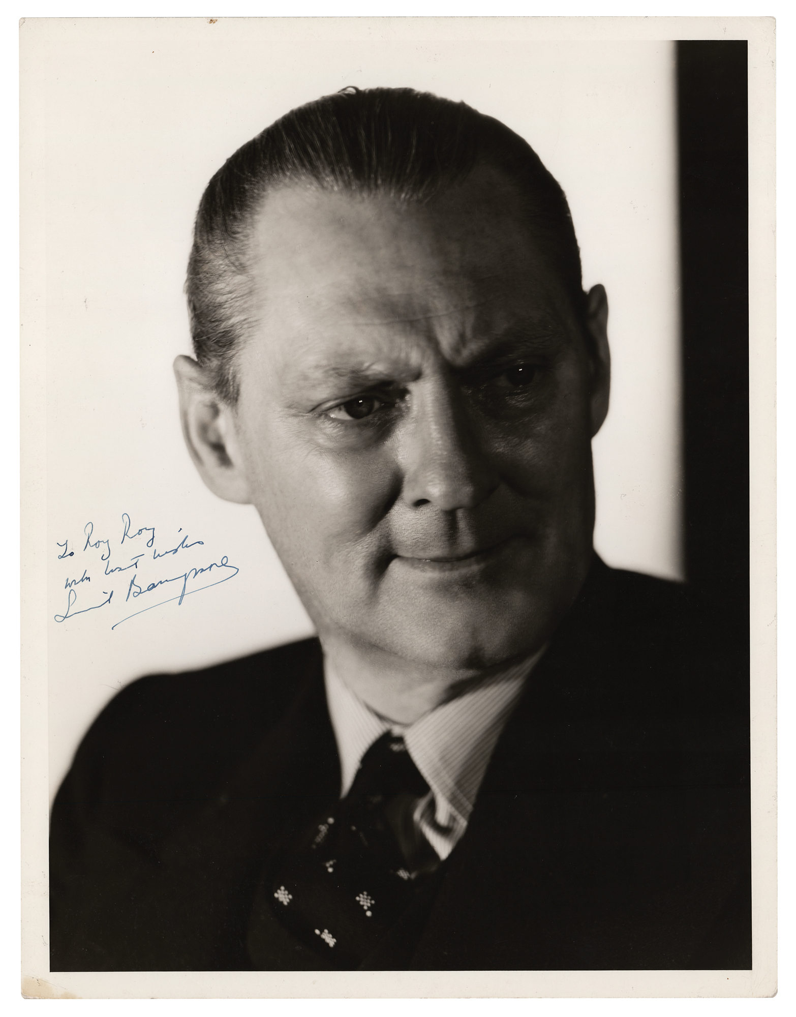 American actor (1878-1954) known for his role as Mr. Potter in It's a Wonderful Life. Vintage semi-glossy 10 x 13 portrait of the Academy Award-winning actor, signed and inscribed in fountain pen, "To Roy Roy, with best wishes, Lionel Barrymore.” In fine condition, with a light crease passing across his forehead. From the David Seltzer collection.