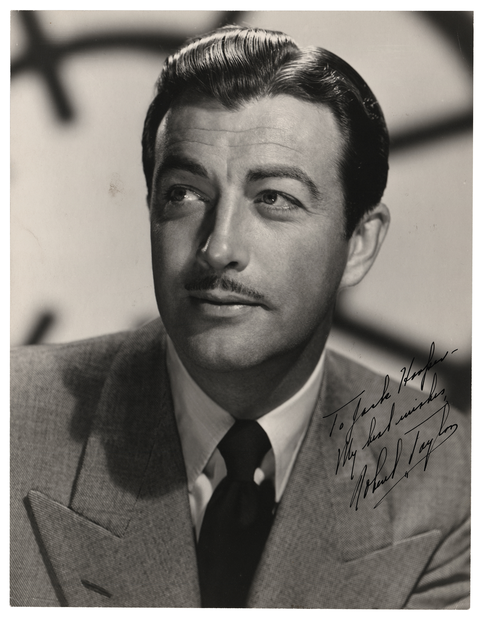 American film and television actor and singer (1911-1969) known as one of the most popular leading men in cinema. Matte-finish 10 x 13 portrait photo of Taylor in a suit and tie, signed and inscribed in fountain pen, "To Jack Hooper, my best wishes, Robert Taylor.” In fine condition. From the David Seltzer collection.