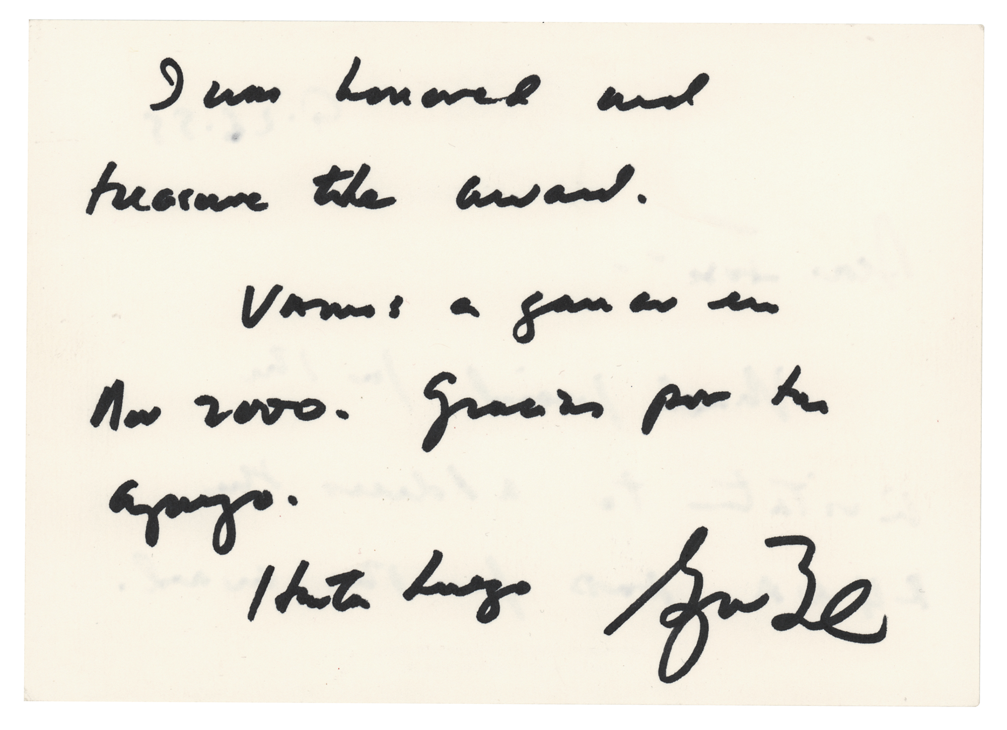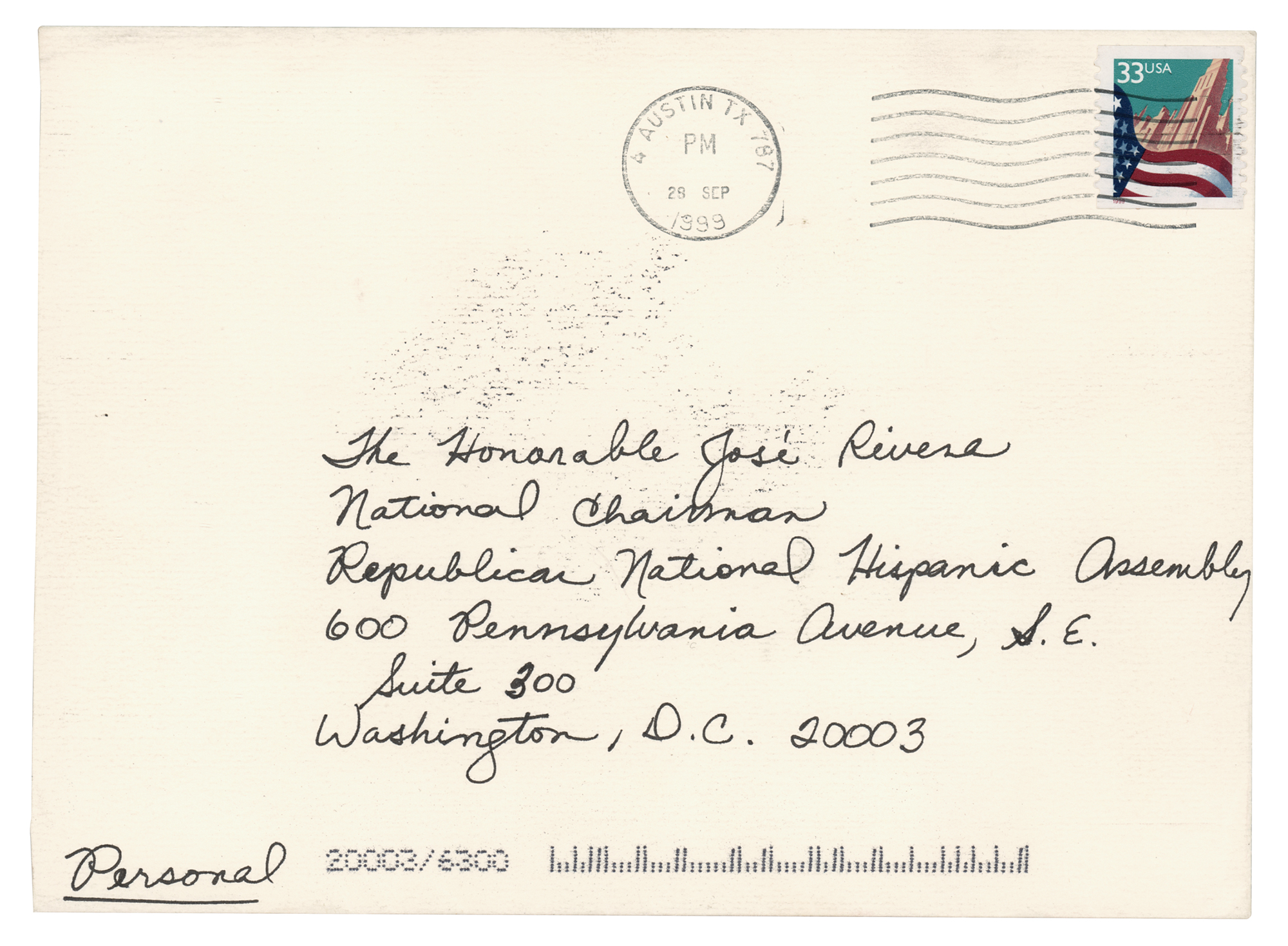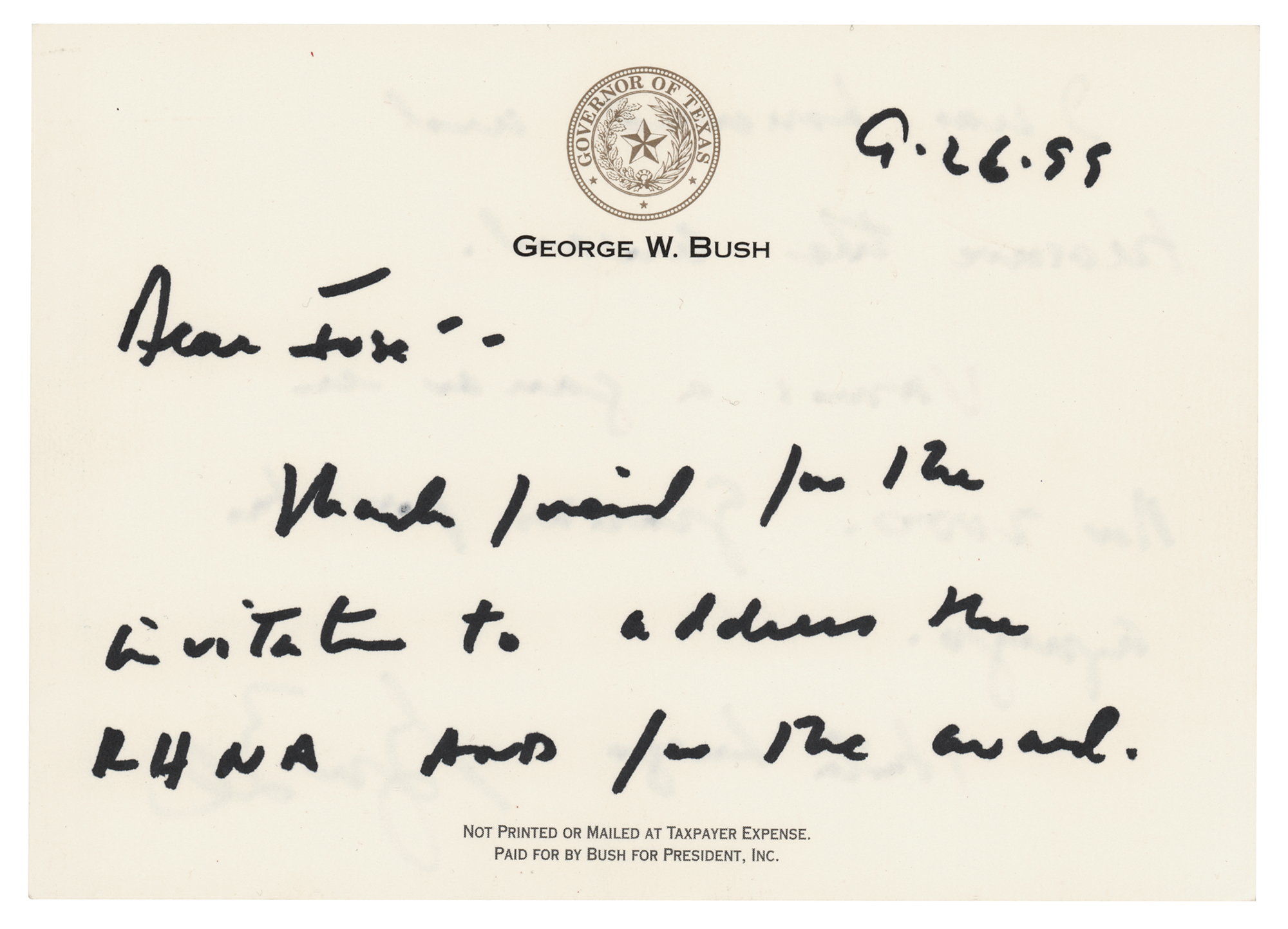 ALS, one page both sides, 7 x 5, Governor of Texas letterhead, September 26, 1999. Handwritten letter to the Hon. Jose Rivera, National Chairman of the Republican National Hispanic Assembly, in full: "Thanks friend for the invitation to address the RHNA [sic] and for the award. I was honored and treasure the award. Vamos a ganar en Nov. 2000. Gracias por tu apoyo. [We are going to win in November 2000. Thanks for your support]. In very fine condition. Accompanied by the original mailing envelope.
