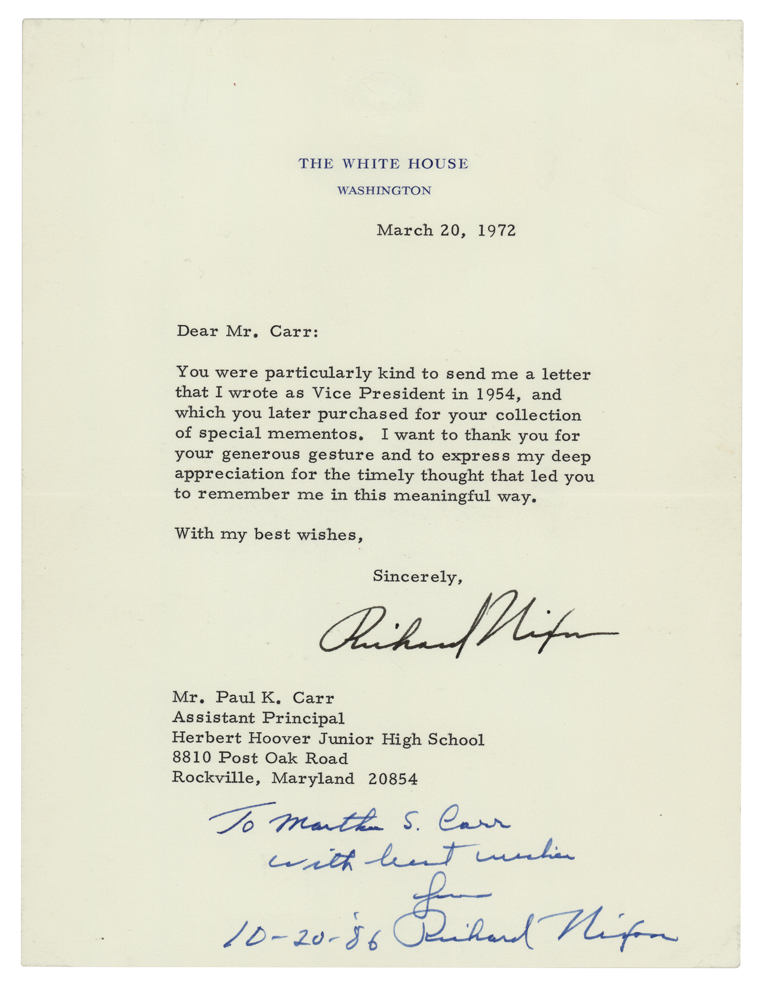 TLS, one page, 6.75 x 8.75, White House letterhead, March 20, 1972. Letter to Paul Carr, assistant principal of Herbert Hoover High School, in full: "You were particularly kind to send me a letter that I wrote as Vice President in 1954, and which you later purchased for your collection of special mementos. I want to thank you for your generous gesture and to express my deep appreciation for the timely thought that led you to remember me in this meaningful way." The letter bears a secretarial signature in black, but was later authentically signed and inscribed in the lower border in blue felt tip, "To Martha S. Carr, with best wishes from Richard Nixon, 10-20-86." In very fine condition. Accompanied by the original White House mailing envelope.