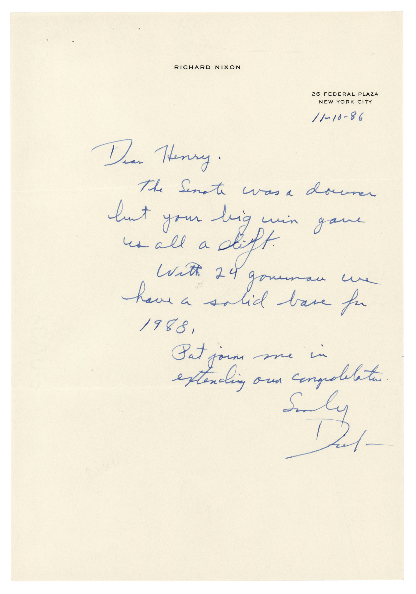 Uncommon ALS, one page, 7.25 x 10.5, personal letterhead, November 10, 1986. Handwritten letter to "Henry," presumably Oklahoma Governor-elect Henry Bellmon. In full: "The Senate was a downer but your big win gave us all a lift. With 24 governors we have a solid base for 1988. Pat joins me in extending our congratulations." In very fine condition.