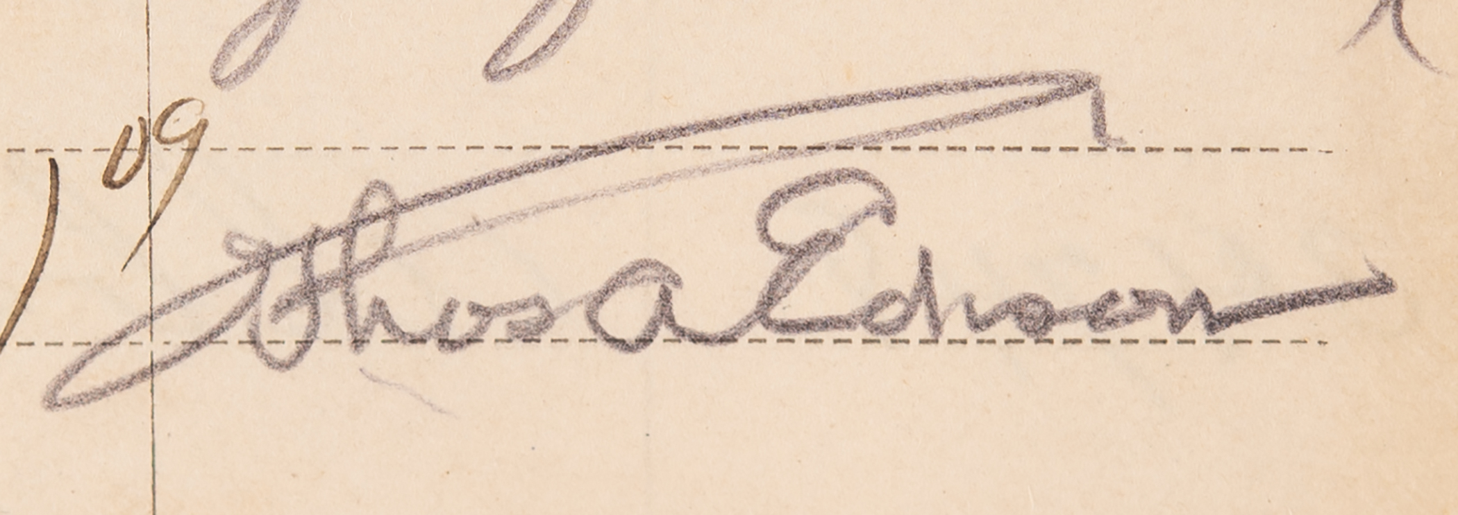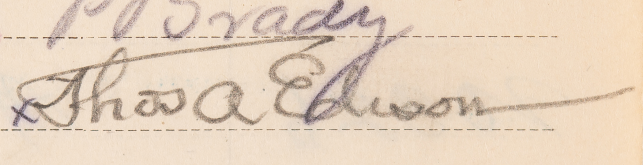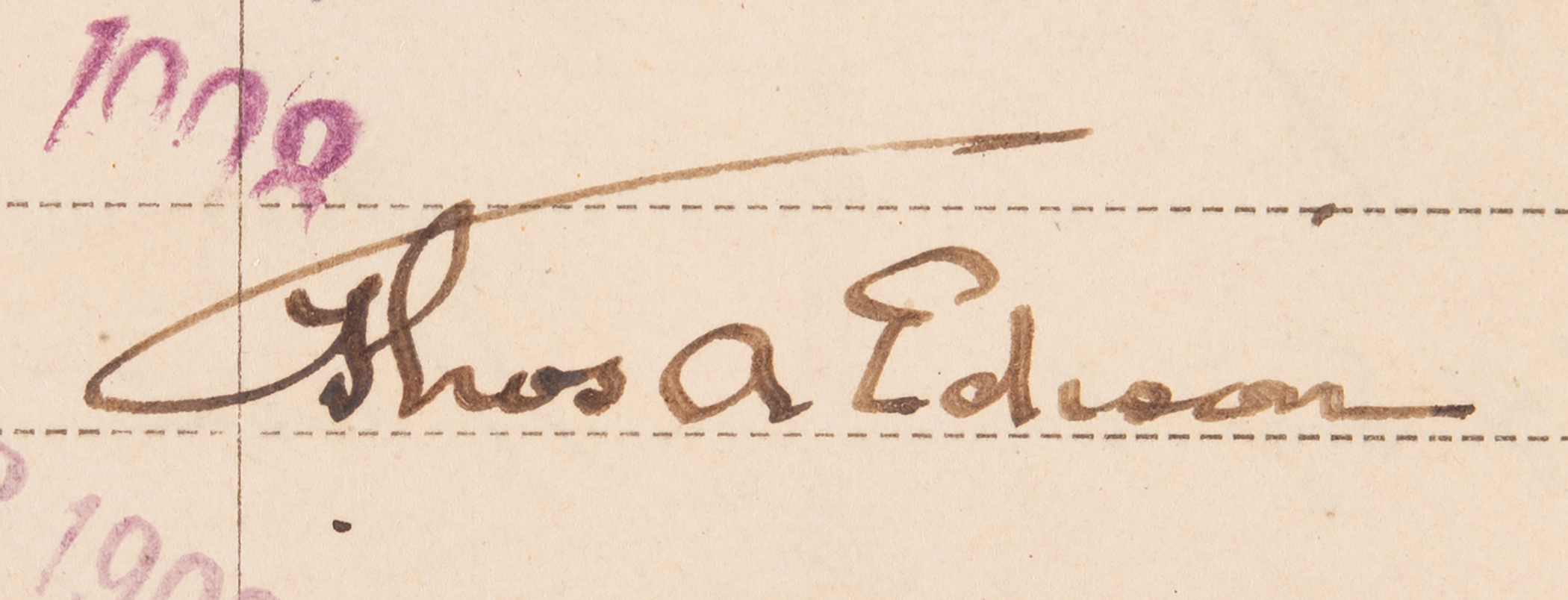 Two postal items from the Post Office in Orange, New Jersey, which contain a total of four Thomas Edison signatures, all of which feature his iconic ‘umbrella’ autograph. The lot consists of a ‘Standing Order’ form, one page, 3.5 x 8, October 1, 1894, signed at the bottom in bold ink, “Thomas A. Edison,” who authorizes John Randolph and Harry Miller to receive registered letters and parcels on his behalf; and three pages removed from a letter carrier log book, 5 x 8, each page signed once by Edison as “Thos. A Edison,” who signs in ink on November 23, 1908, and in pencil on both December 21, 1908, and on May 17, 1909. The three log book pages feature several secretarial signatures, which are missing Edison’s trademark ‘umbrella.’ In overall fine condition.