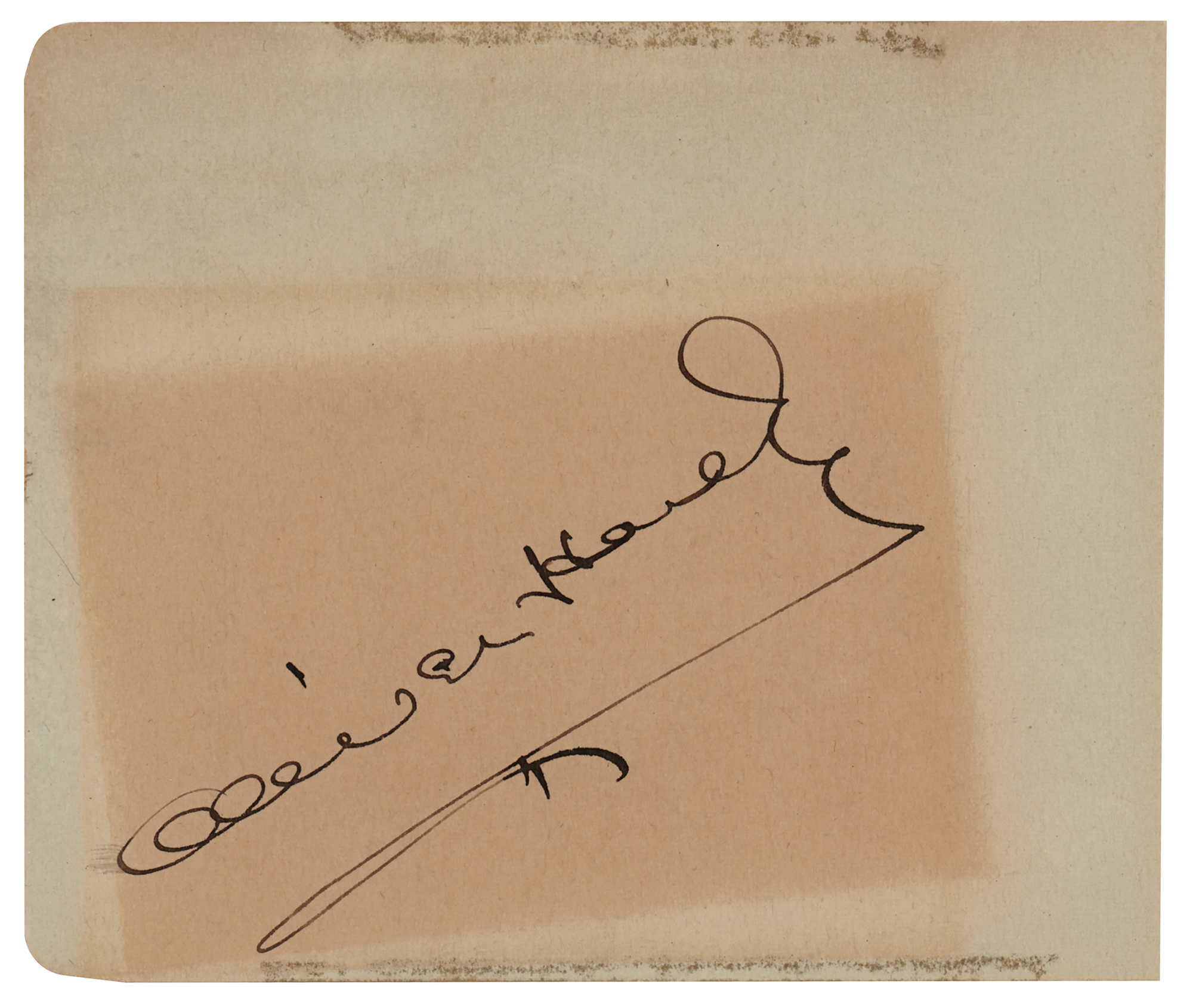 Vintage fountain pen signature, "Oliver Hardy,” on an off-white 5.25 x 4.5 album page, also signed on the reverse by actor John Howard. In fine condition, with toning from prior display.