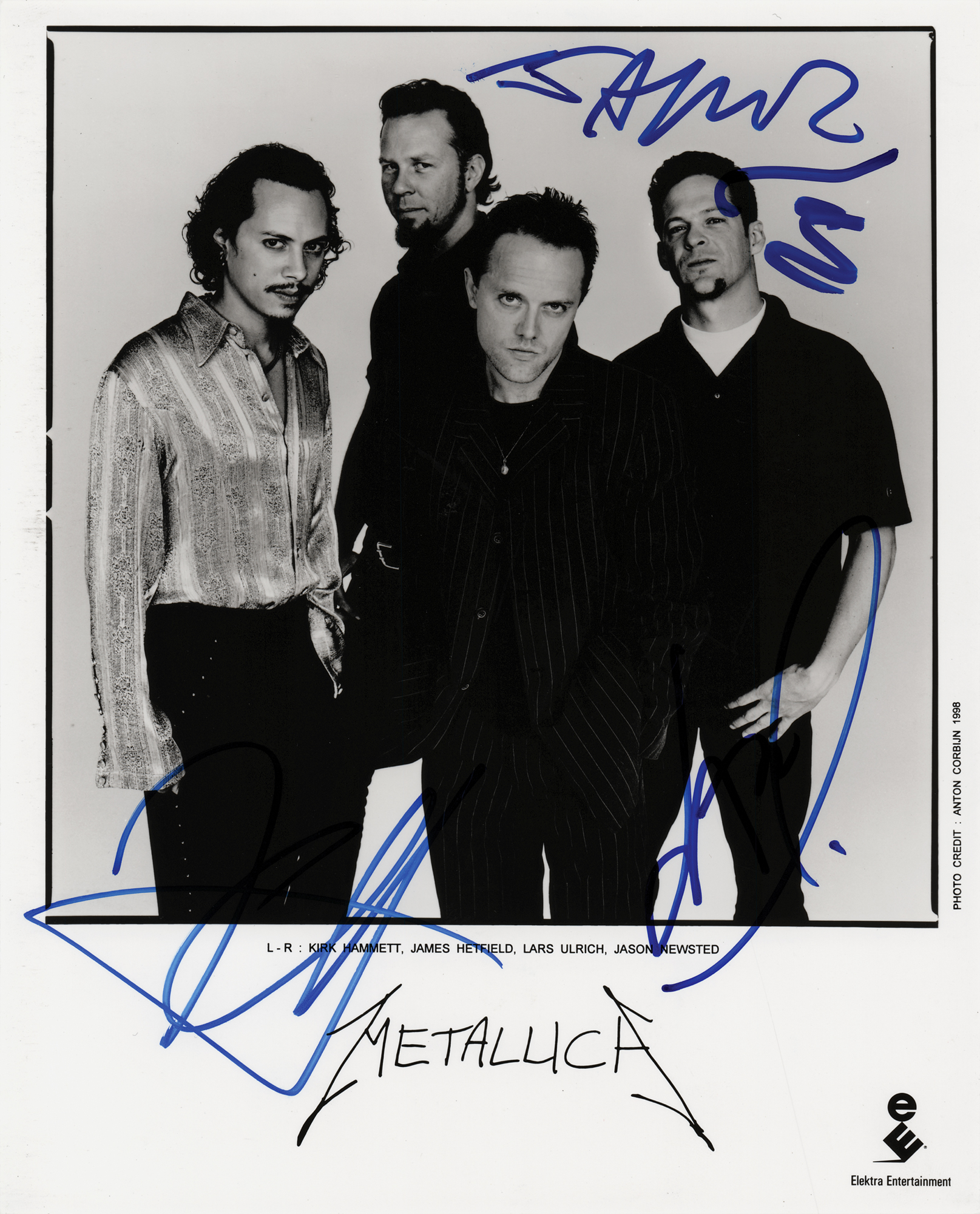 Satin-finish 8 x 10 Elektra Entertainment publicity photo of Metallica, signed in blue felt tip by Kirk Hammet, James Hetfield, Lars Ulrich, and Jason Newsted. In fine condition, with a few light surface gouges.