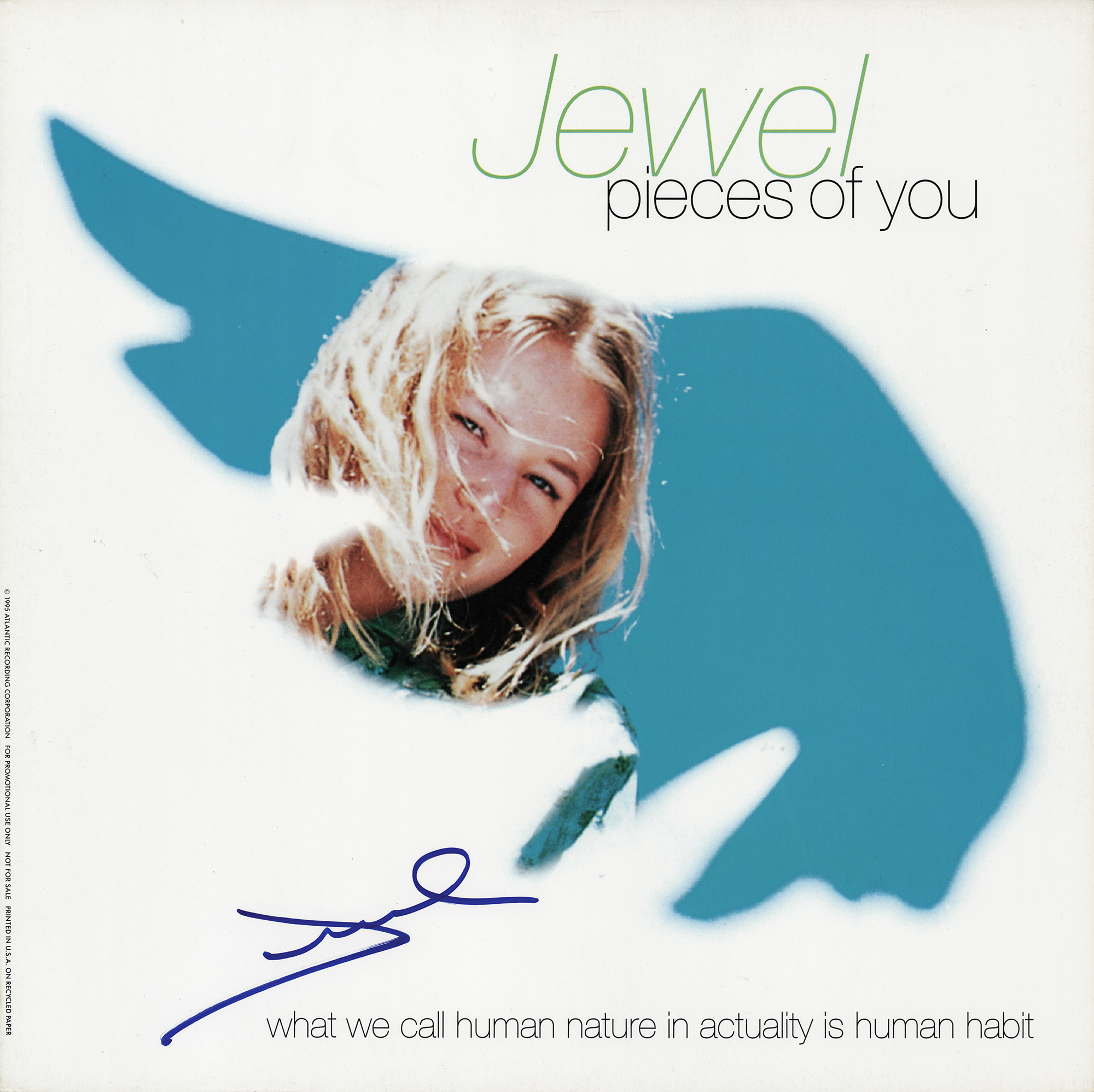 Pieces of You album flat signed in blue felt tip by Jewel. In very fine condition.