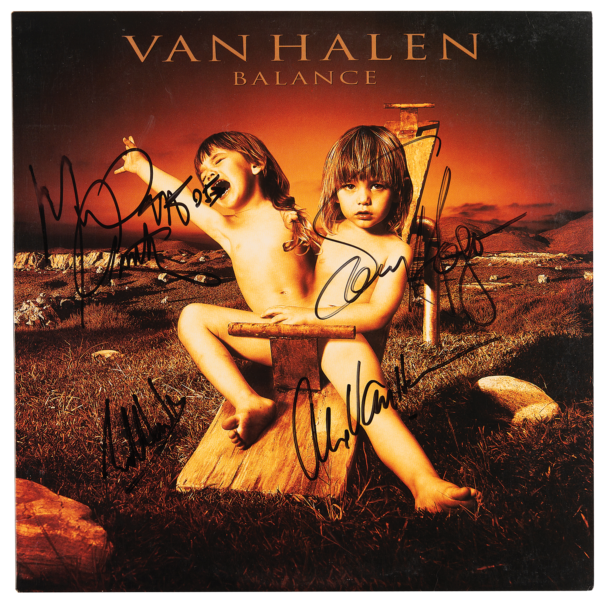 Balance album by Van Halen, signed on the front cover in black felt tip by Alex Van Halen, Michael Anthony, Eddie Van Halen, and Sammy Hagar. In fine condition. The record is included.