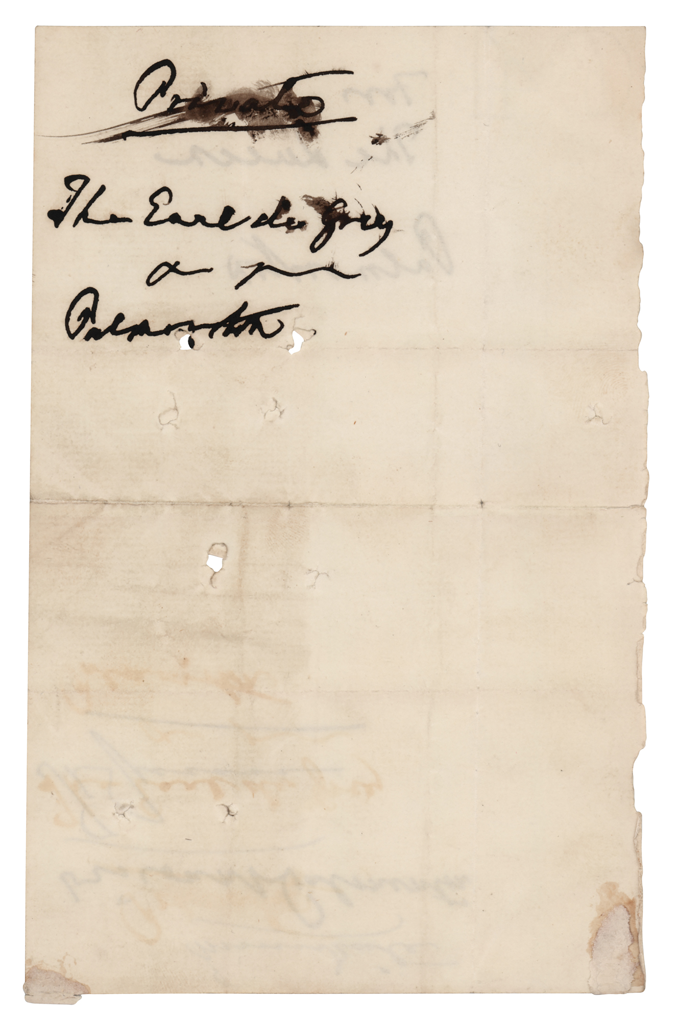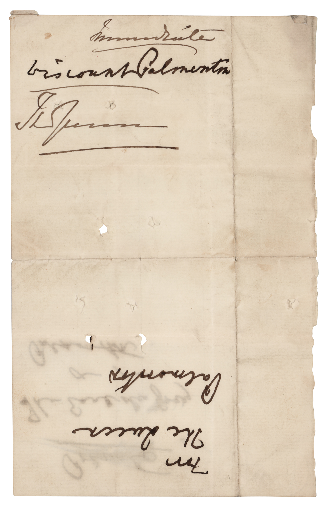 Third-person ink endorsement signature of Queen Victoria, "Immediate, The Queen,” on an off-white 4.5 x 7 docketing panel, also signed three times by Lord Palmerston, who served as prime minister from 1855–1858 and 1859–1865: "Viscount Palmerston," "The Queen, Palmerston," and, on the opposite side, "Private, The Earl de Grey, Palmerston." In very good to fine condition, with intersecting folds, scattered creasing, and three small holes.