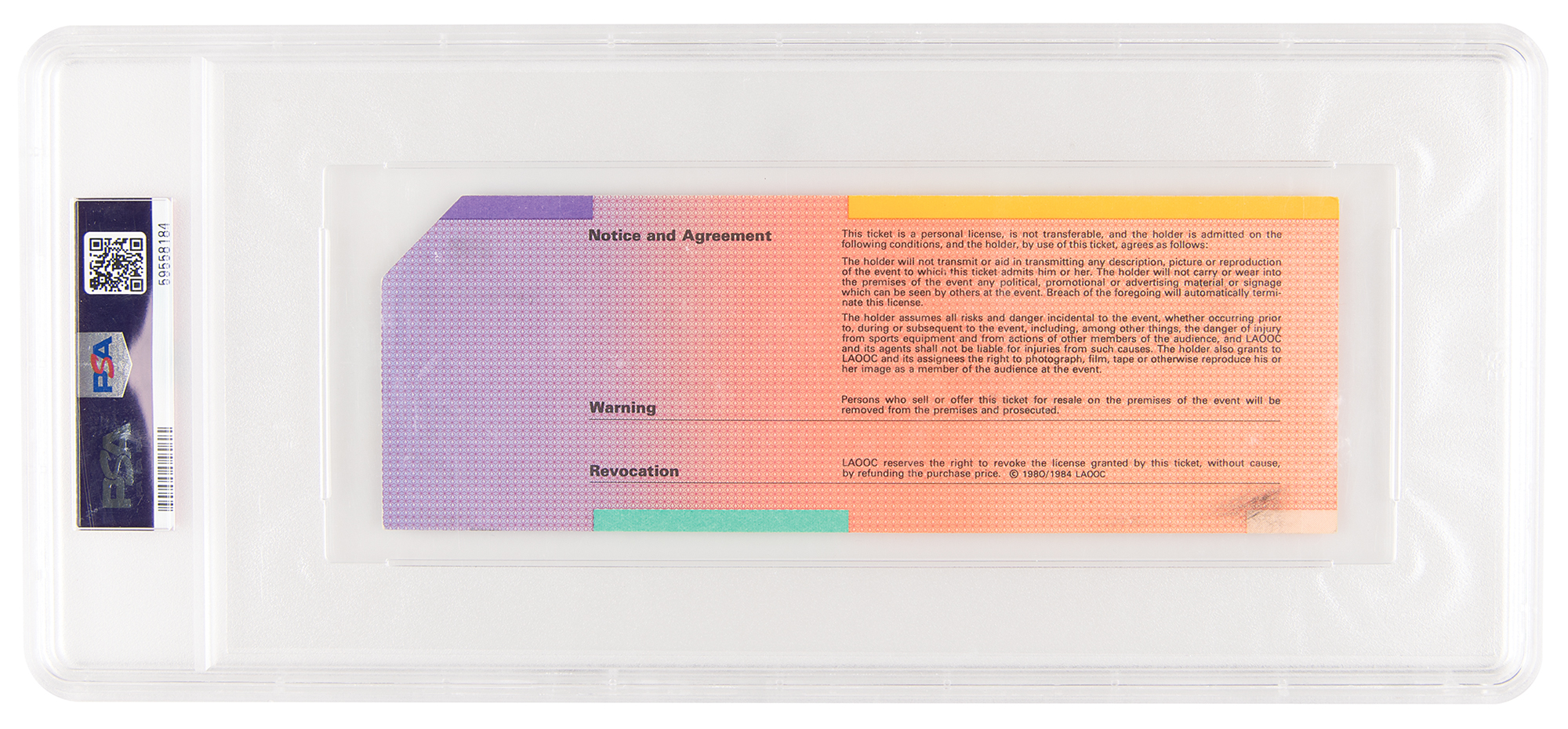 Ticket stub for the closing ceremony of the "Games of the XXIIIrd Olympiad Los Angeles 1984," measuring 7.75 x 2.75, prominently signed in blue felt tip by legendary American composer John Williams, composer of a new 'Olympic Fanfare and Theme' for the Games. Today, this theme is one of the most recognizable and consistent elements of Olympic broadcasts in America. In fine condition. Encapsulated and graded by PSA/DNA as "STUB AUTHENTIC/AUTO 10."